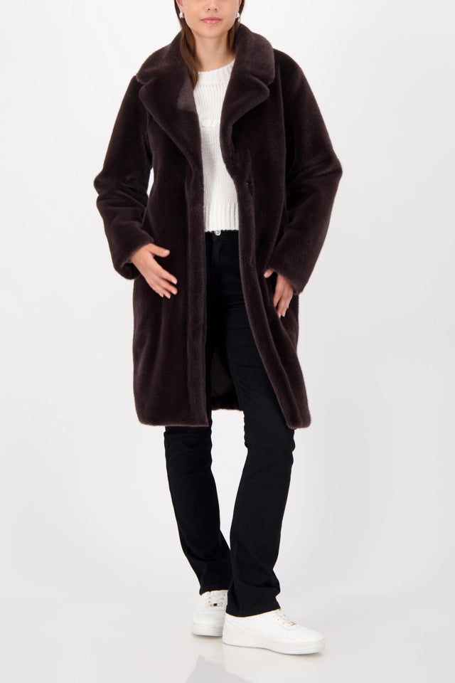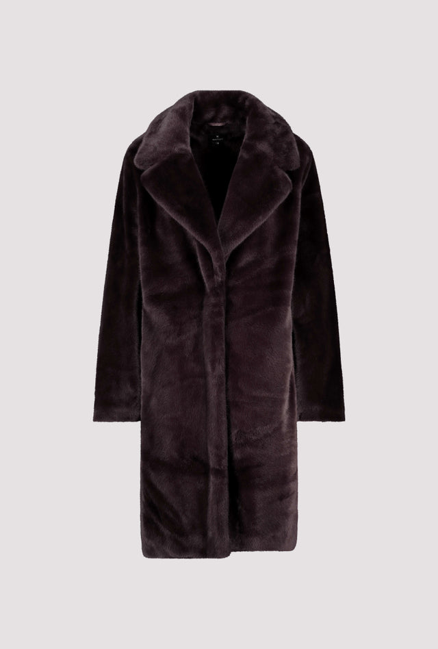 Abrigo largo marrón chocolate de piel sintética de la firma MONARI. La prenda impresiona por su tacto esponjoso, corte largo, ajuste regular ,cuello de solapa , manga larga, bolsillos de ojal y cierre con botones de presión ocultos. Colección de MONARI en diheratelier.com