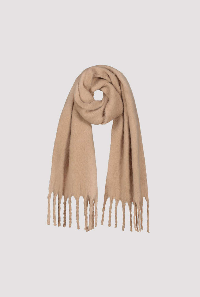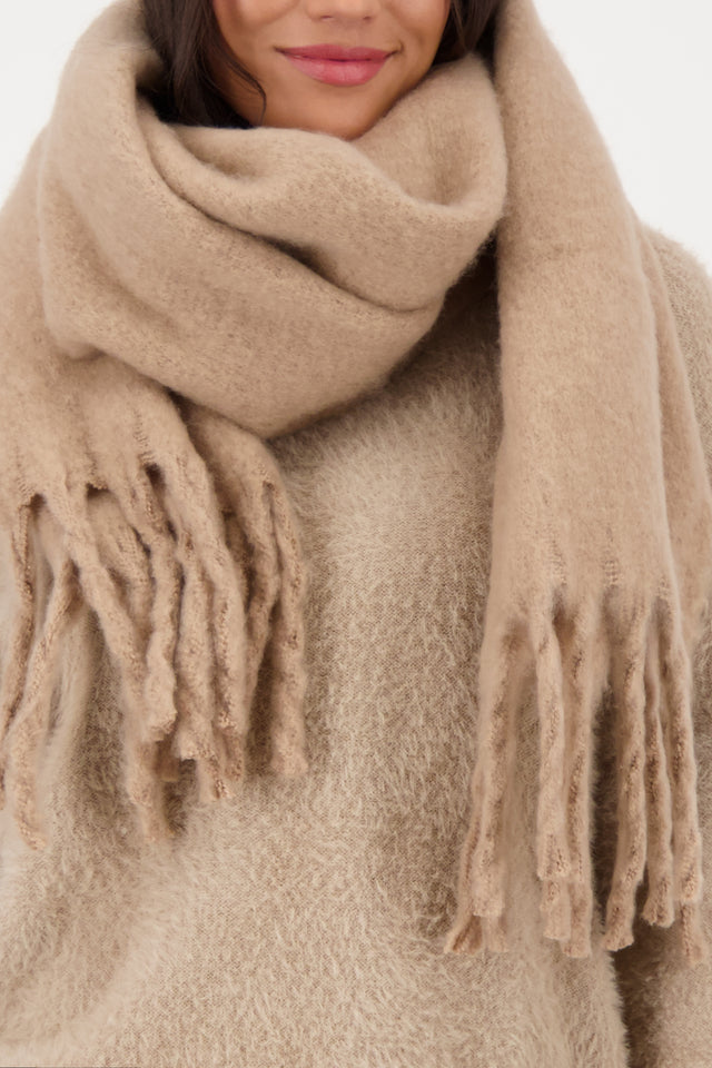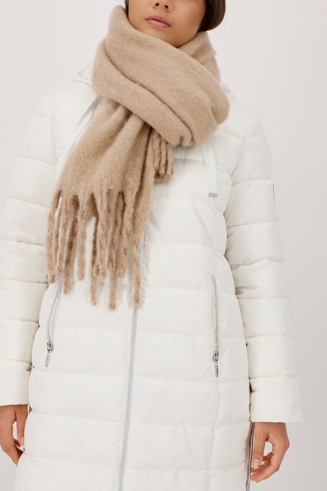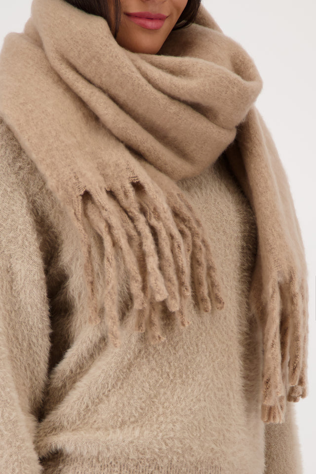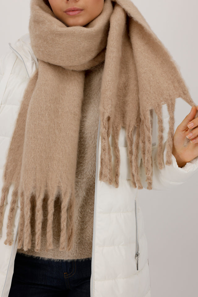 Bufanda esponjosa color trufa de la firma MONARI. De tamaño rectangular y con unos flecos largos tiene unas dimensiones generosas de 180x40cm. Colección de MONARI en diheratelier.com