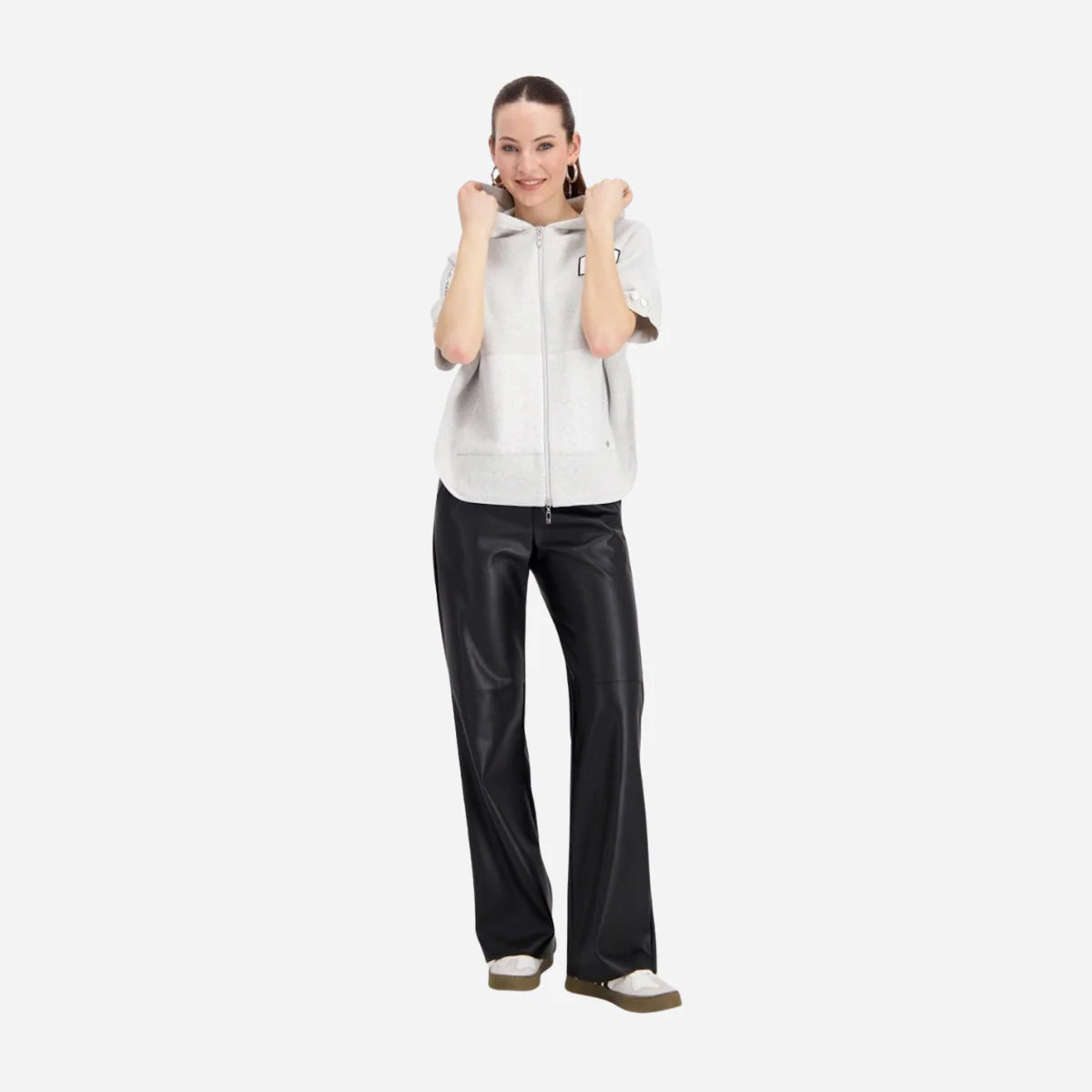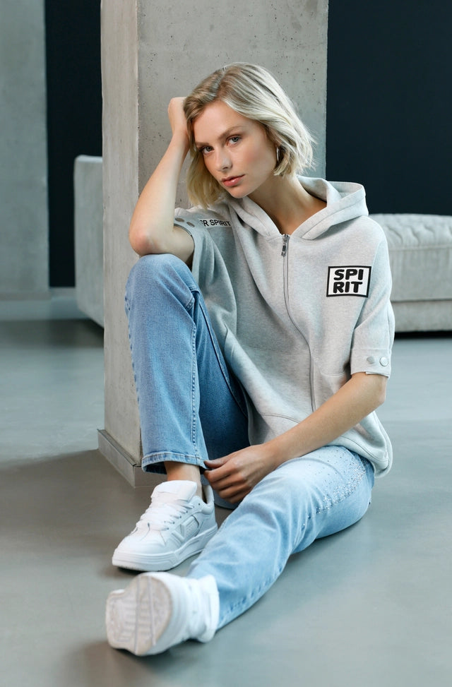 Capa con cremallera de la firma MONARI. La prenda realizada en algodón color gris, parche decorativo, bolsillos abiertos, cremallera de doble cursor, hombros caídos, manga corta, capucha y puntas laterales redondeadas. Colección de MONARI en diheratelier.com