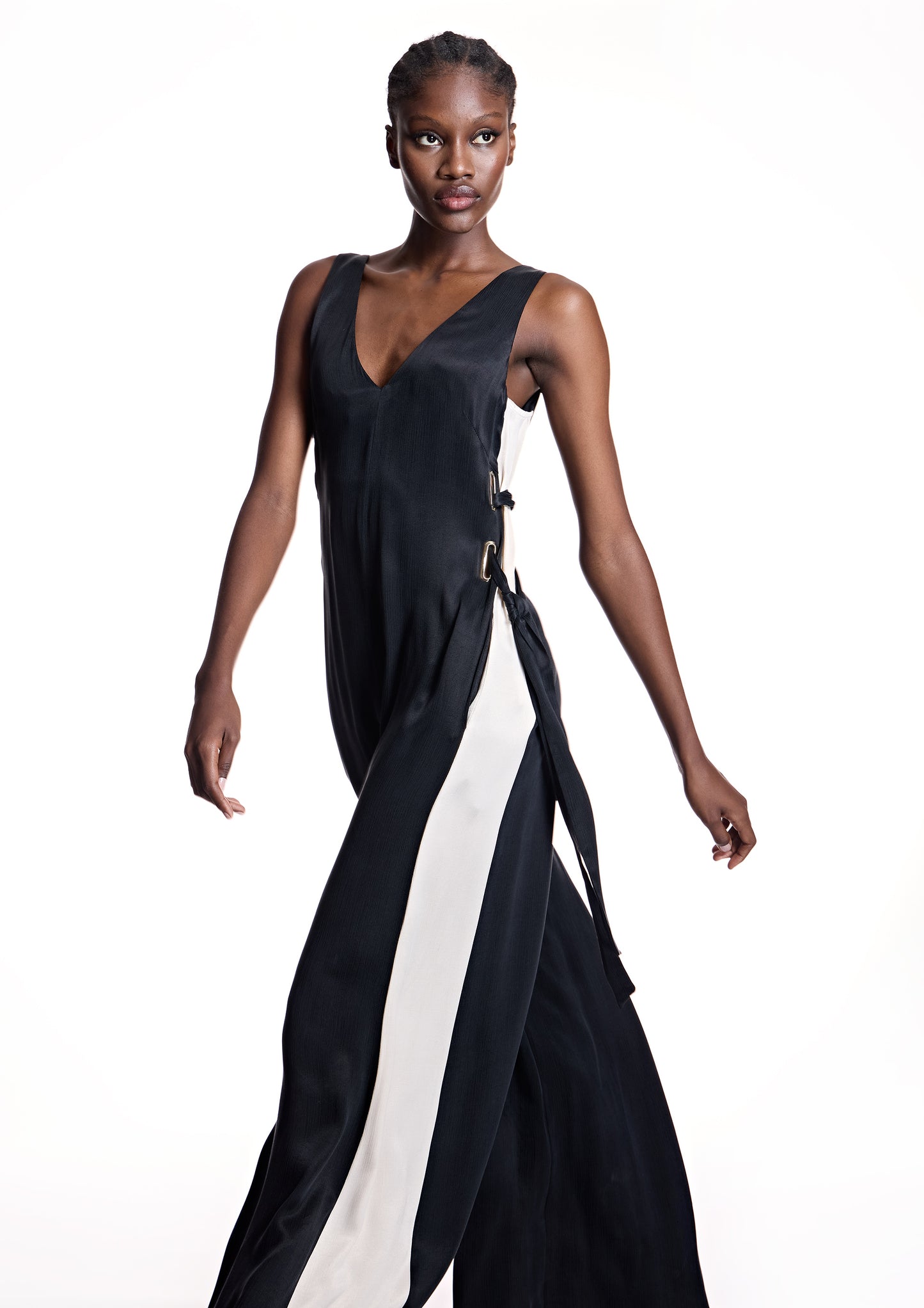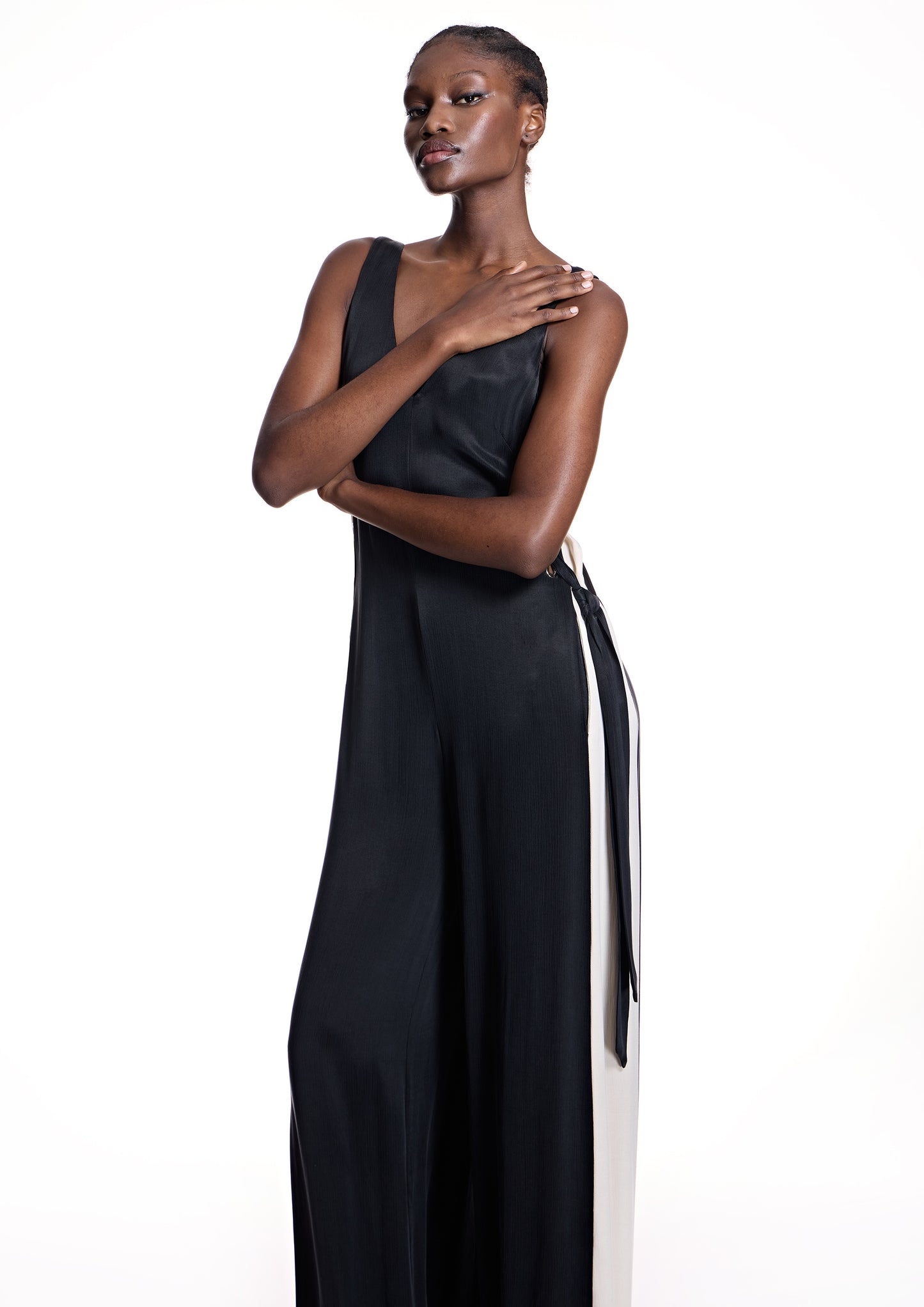 Mono fluido bicolor de ALBA CONDE COLECCION INVITADA. La prenda con un favorecedor escote pico en delantero y espalda, laterales a contraste, se ciñe en cintura con cintas laterales en negro que pasan por unos ojetes metálicos. El modelo presenta corte semientallado, bolsillos laterales, cierre central posterior con cremallera invisible y confeccionado con forro interior. Colección de ALBA CONDE en diheratelier.com