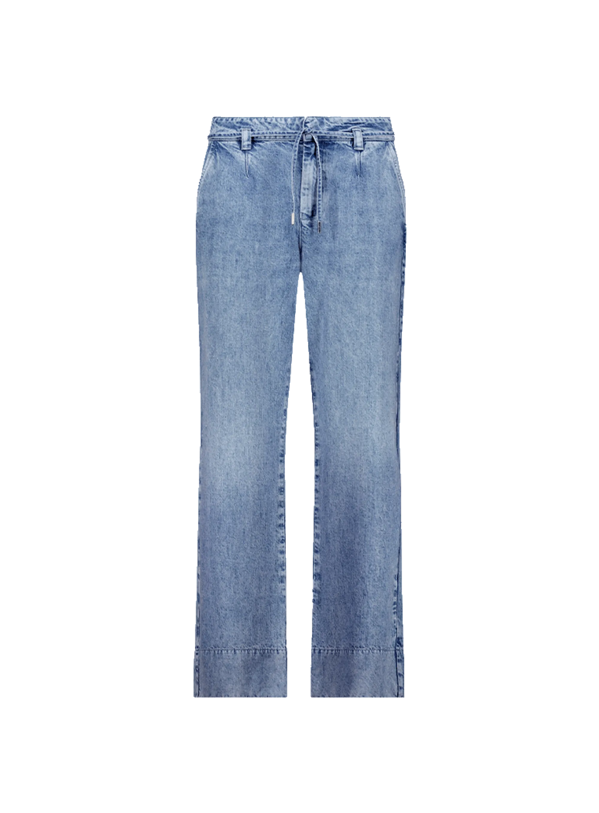 Pantalón lyocell de pata ancha en azul MONARI. La prenda con goma en la cintura, cordón de ajuste en el mismo tejido, bolsillos laterales en el delantero y bolsillos falsos de ojal en la parte trasera. Colección de MONARI en diheratelier.com