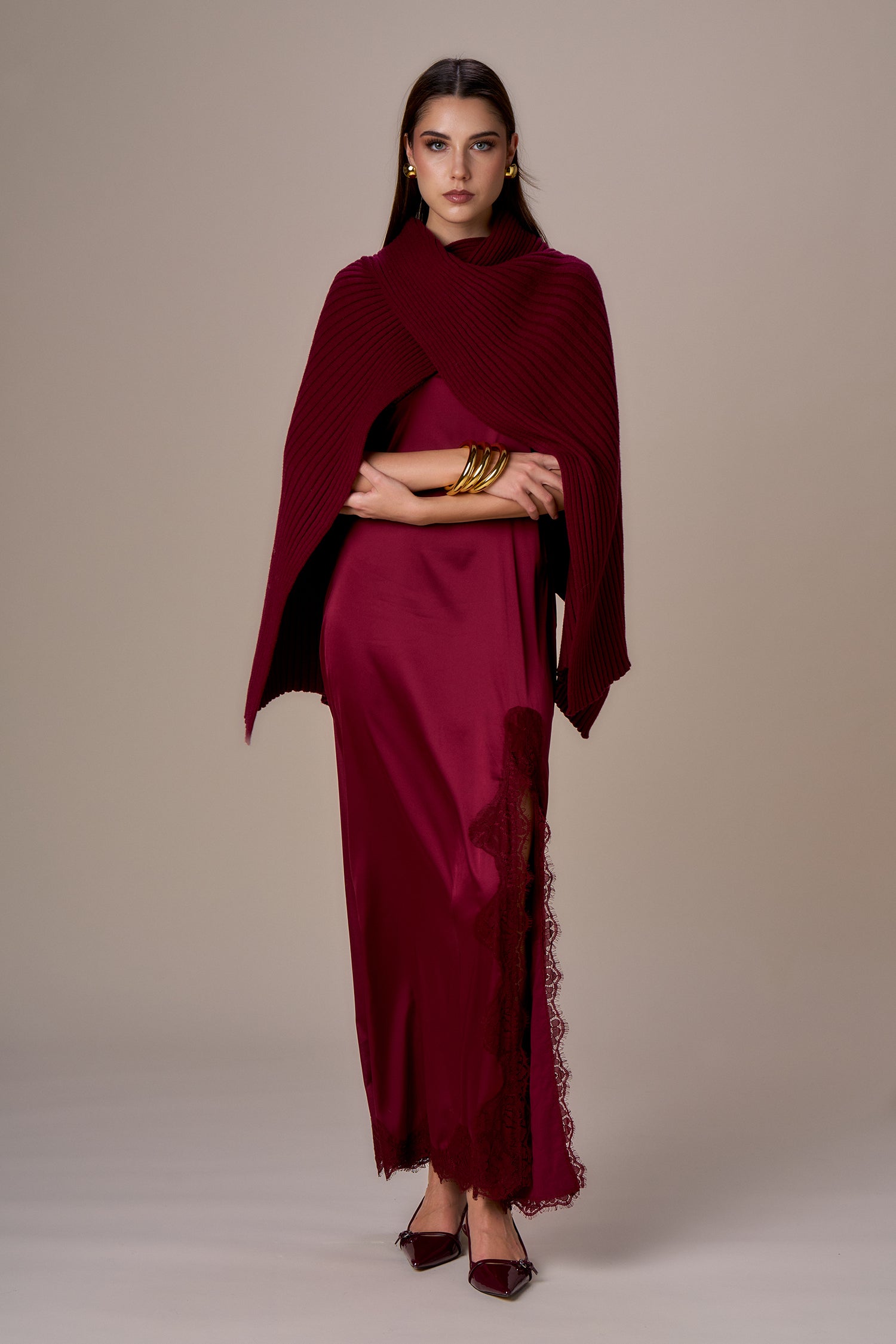 Poncho en punto canalé color burdeos de la firma italiana NO SECRETS. La prenda de corte asimétrico tiene cuello alto, cruce a la altura del hombro y abierto tanto por delante como por detrás. Colección de NO SECRETS en diheratelier.com