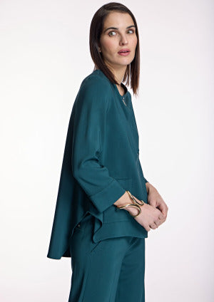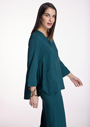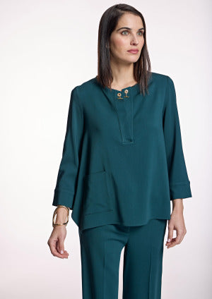 Blusón en verde petróleo de la colección ALBA CONDE. Este blusón de mangas tres cuartos, escote redondo con detalle de abertura y gemelo en el escote delantero, corte ligeramente evasé con amplias aberturas laterales, bajo asimétrico y adorno de bolsillo en el lateral derecho de la prenda. Colección de ALBA CONDE en diheratelier.com