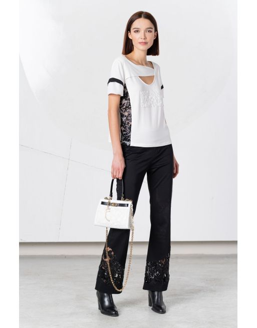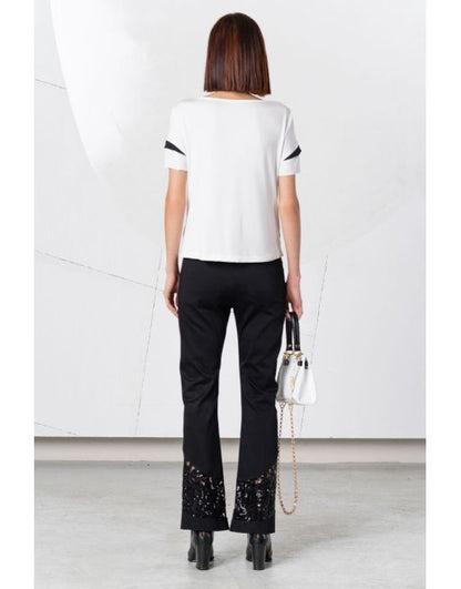Camiseta con original abertura en el delantero de la firma ELISA CAVALETTI. La prenda realizada en blanco y negro con la combinación de diferentes tejidos sello de la casa, tiene manga corta y relieve a tono en el centro del delantero. Colección de ELISA CAVALETTI en diheratelier.com