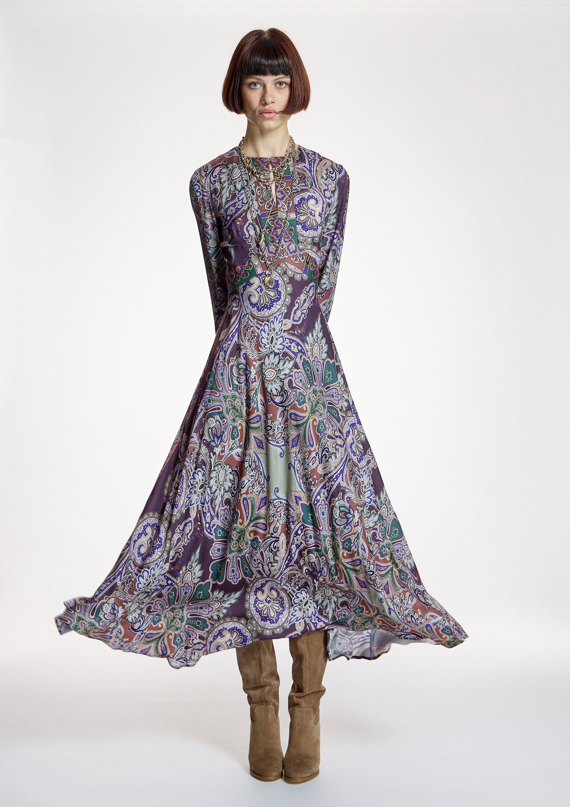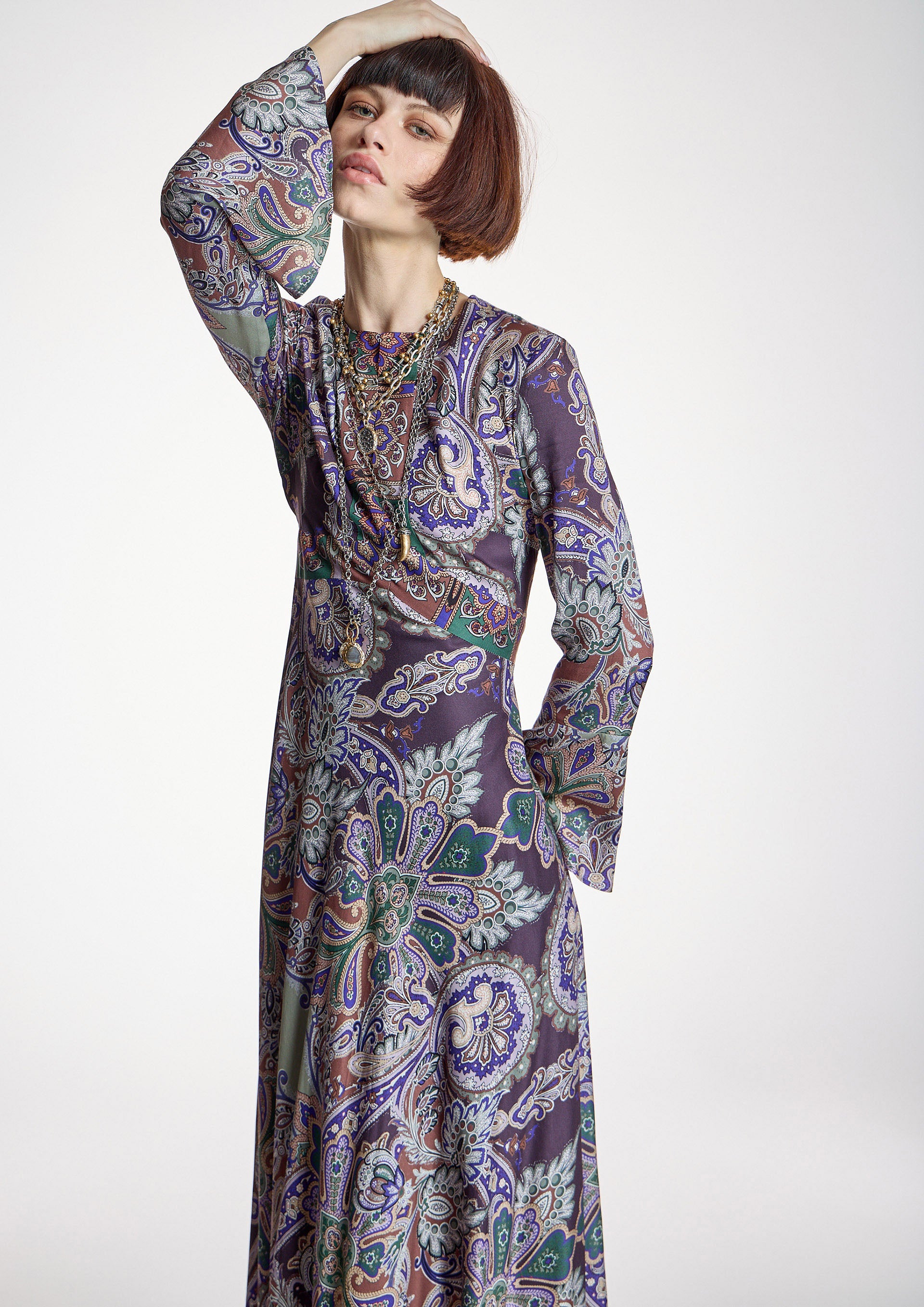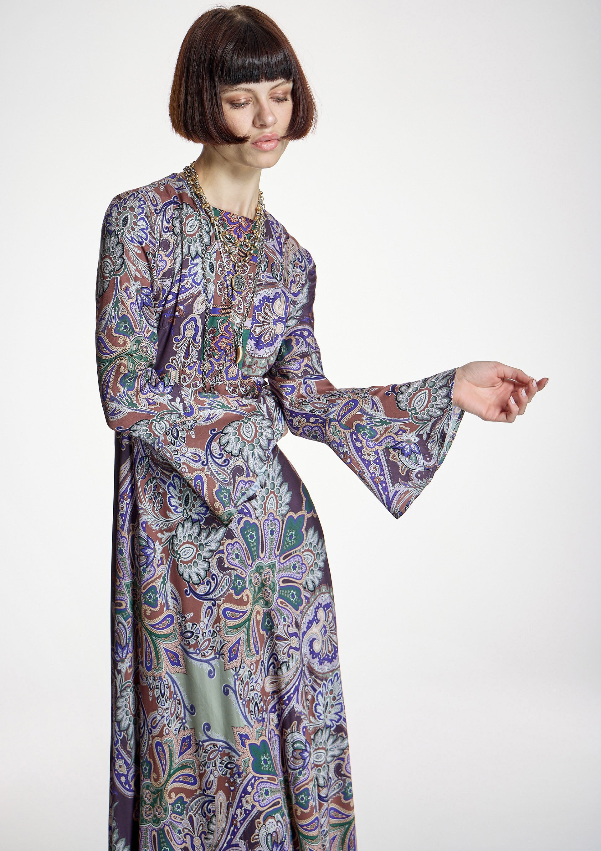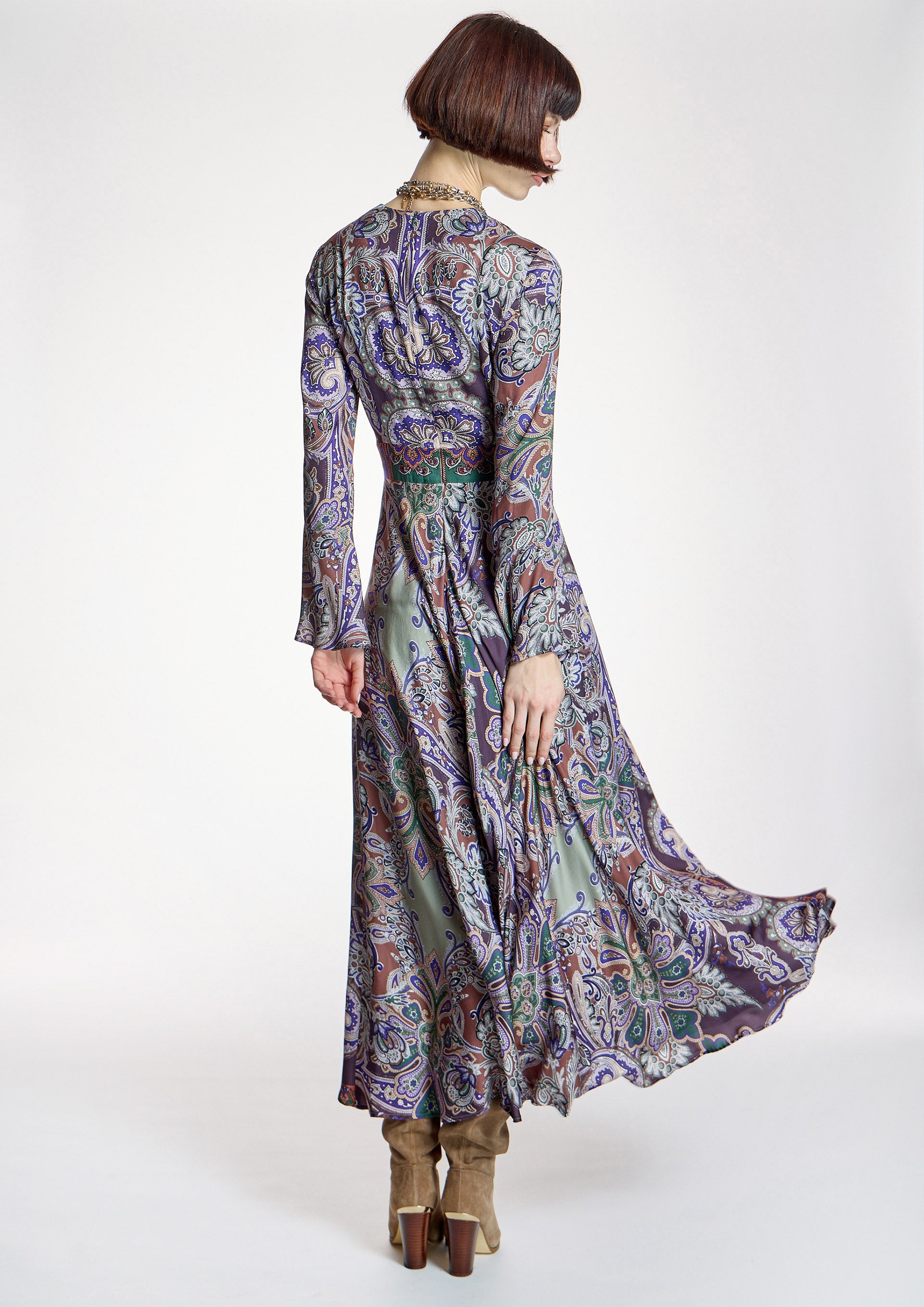 Vestido largo estampado cachemir de ALBA CONDE. La prenda con corte a la cintura tiene falda evasé con bajo recto, cuello caja con abertura en centro del delantero, cierre en centro de espalda con cremallera invisible, manga larga con puño de volante y forro interior. Colección de ALBA CONDE en diheratelier.com