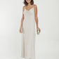 Vestido largo de ALBA CONDE en satinado fluido con tirantes finos. Presenta aplique aro en el escote de la espalda, corte semientallado con ligero evasé en el bajo y forro interior. Perfecto para eventos elegantes y sofisticados.