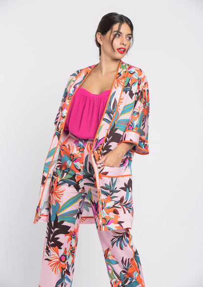 Kimono à fleurs AC avec finitions vives. Manches trois-quarts, poches plaquées devant et ourlet droit.
