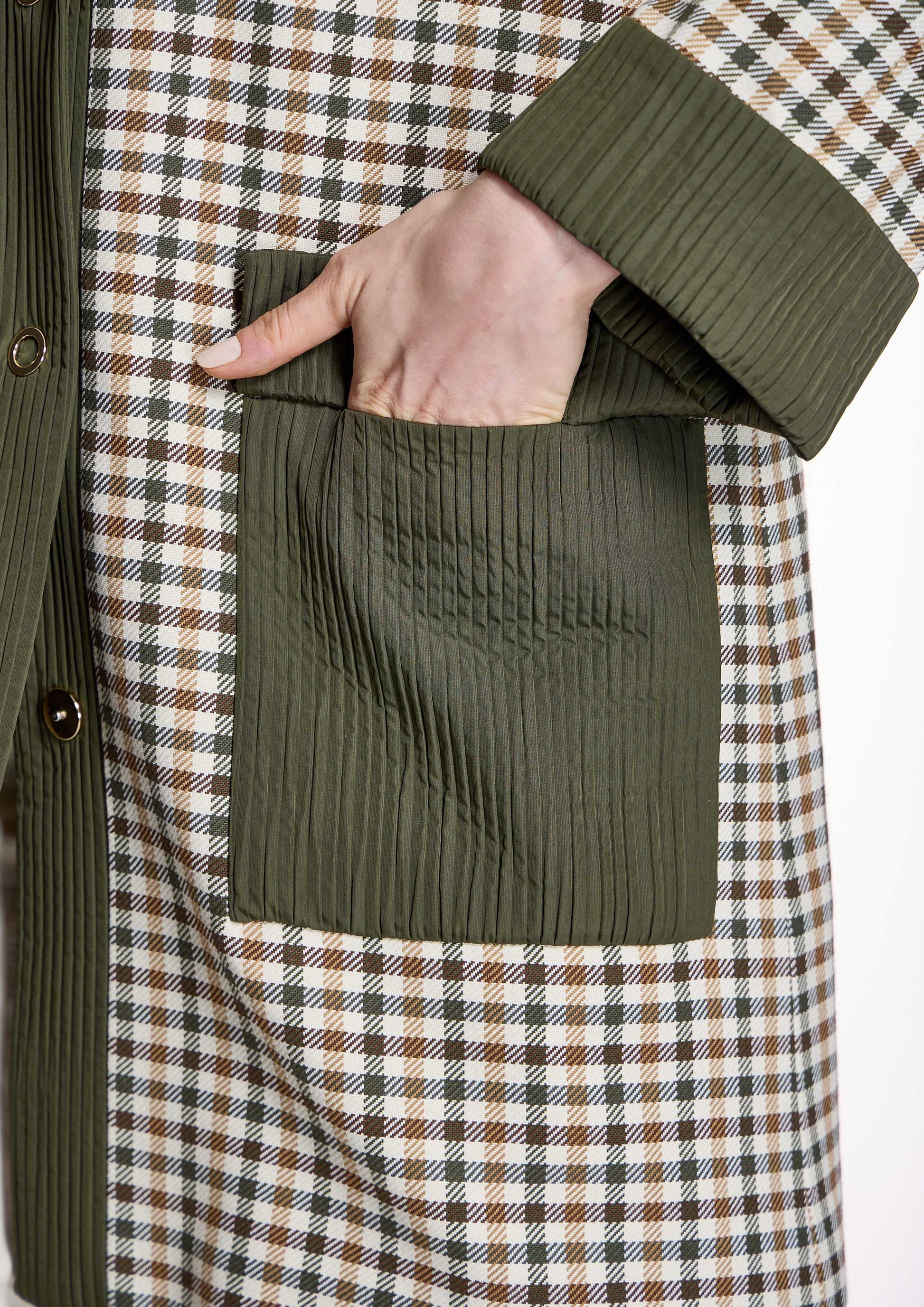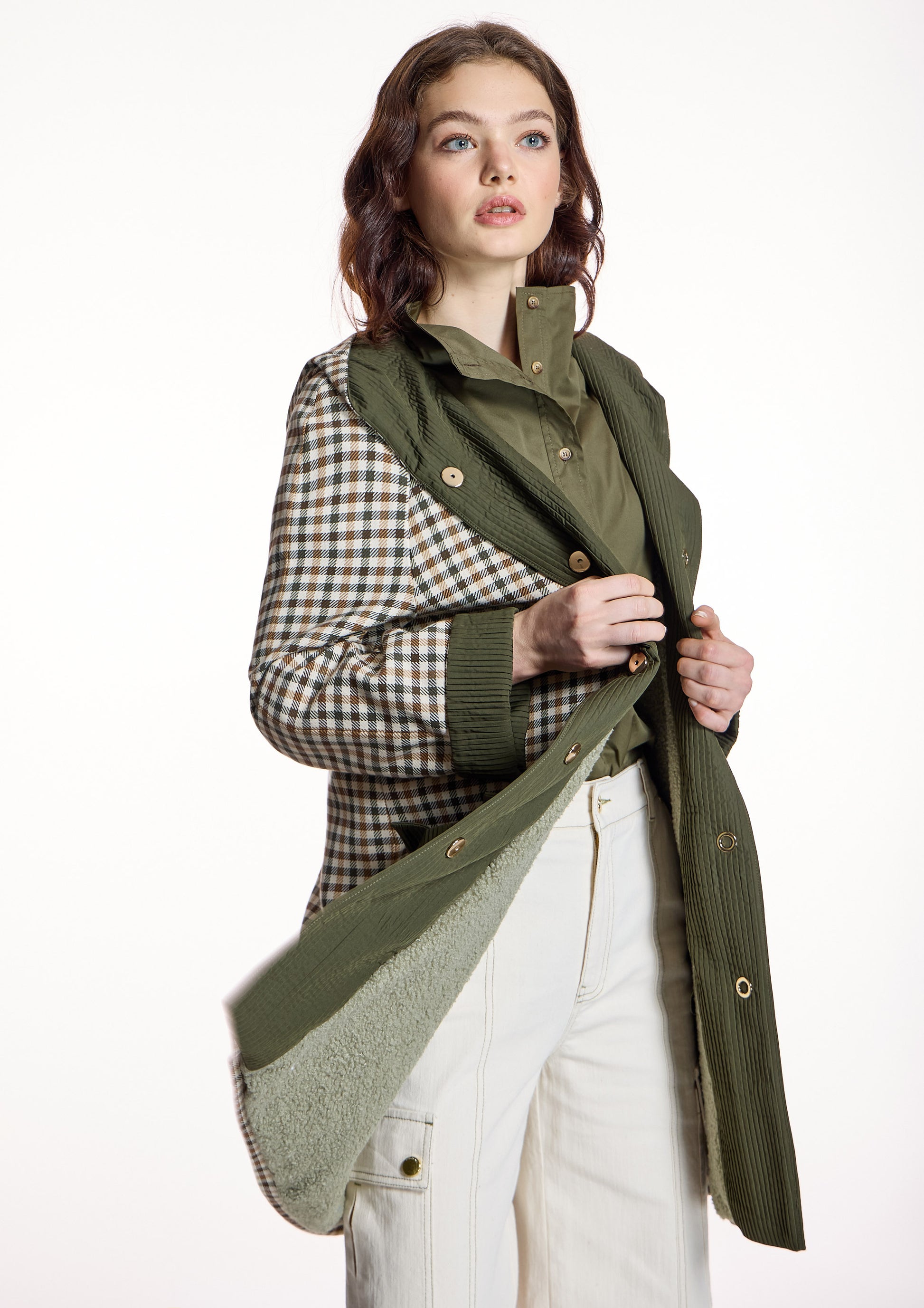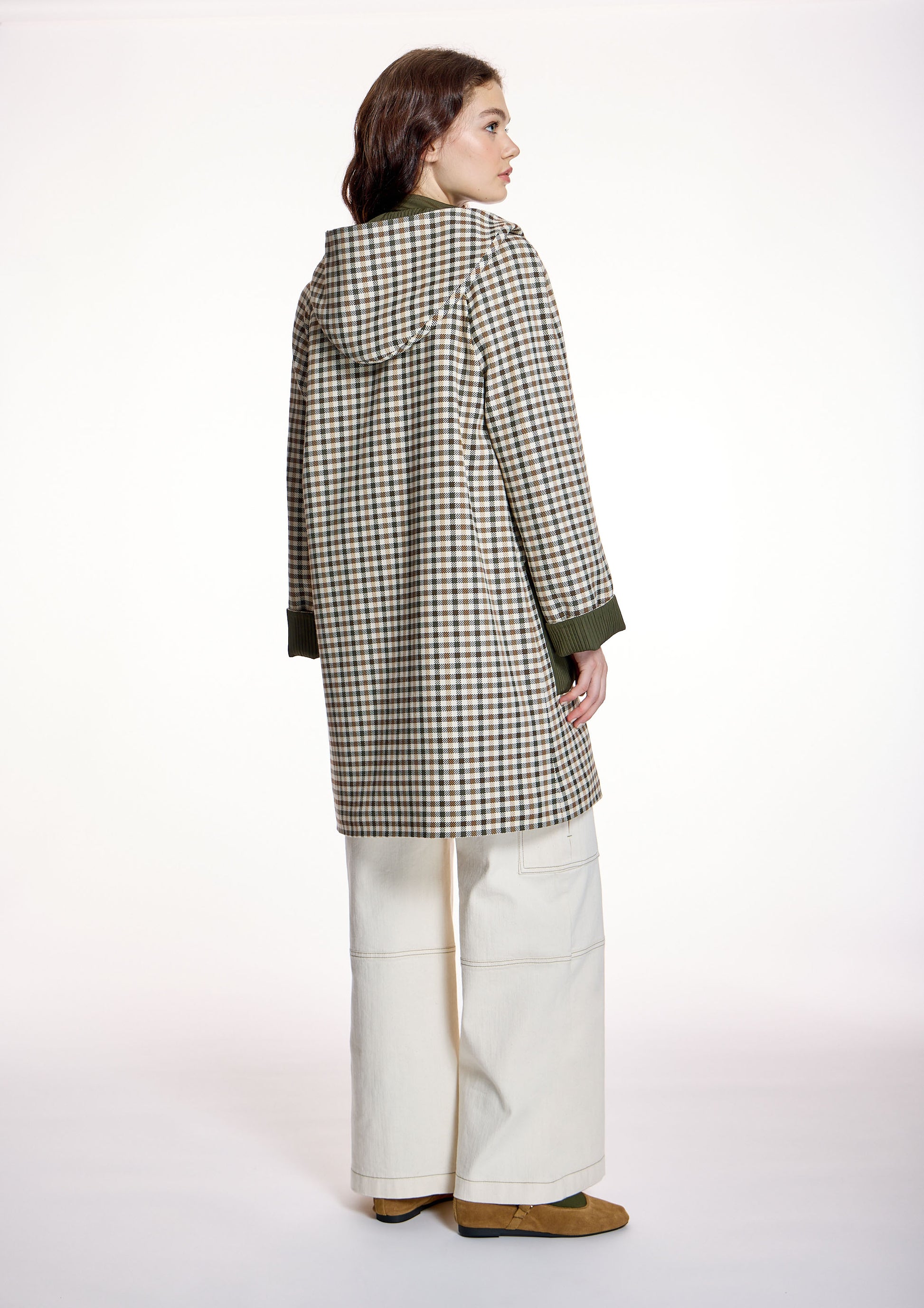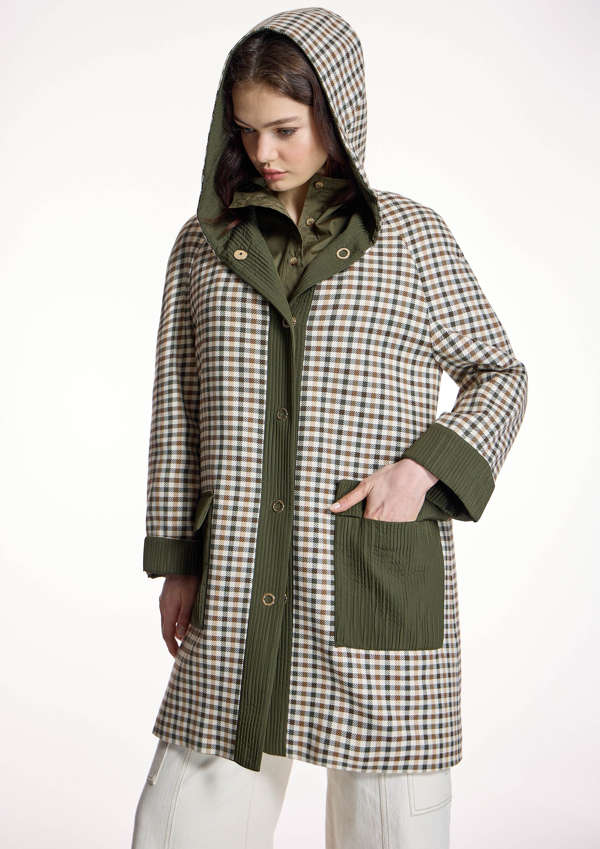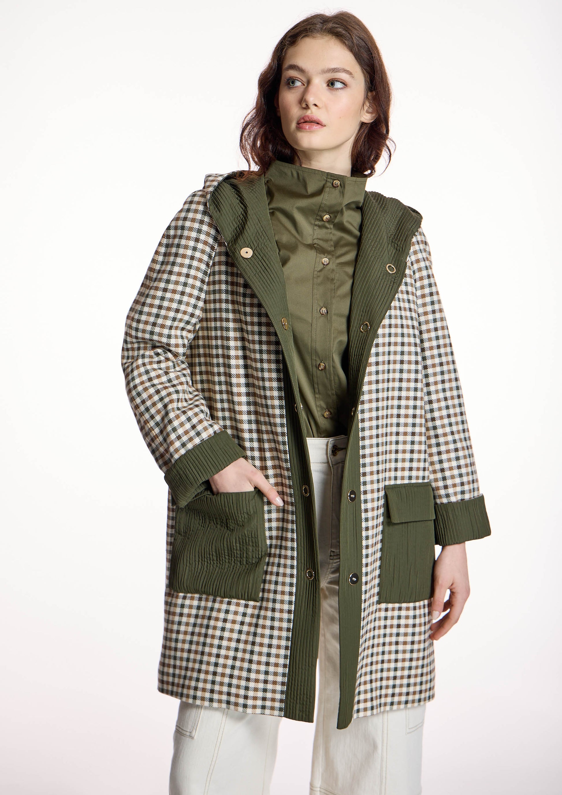 Parka larga de cuadros tostados y caqui de la firma española ALBA CONDE. La prenda de corte recto, cuello con capucha fija, manga larga con vuelta, bolsillos de plastrón a contraste en color verde con tapeta, vista en centro de delantero en color verde con botones de presión, bajo recto y forro de borreguito. Colección de ALBA CONDE en diheratelier.com