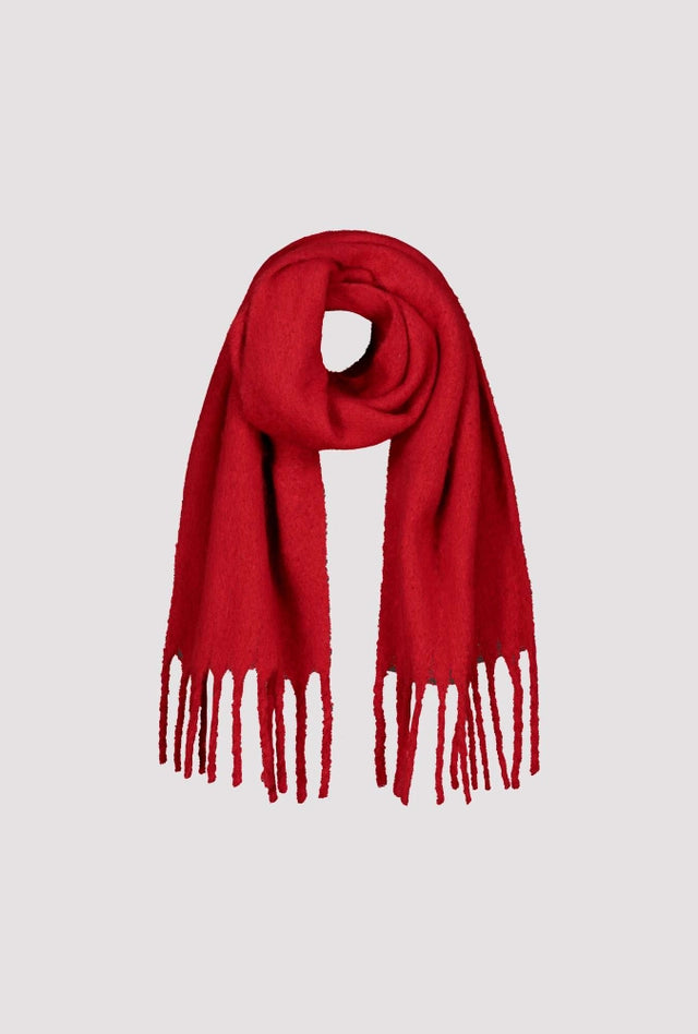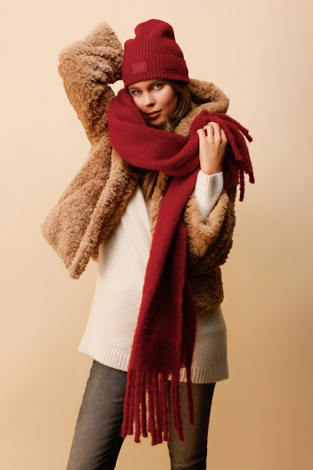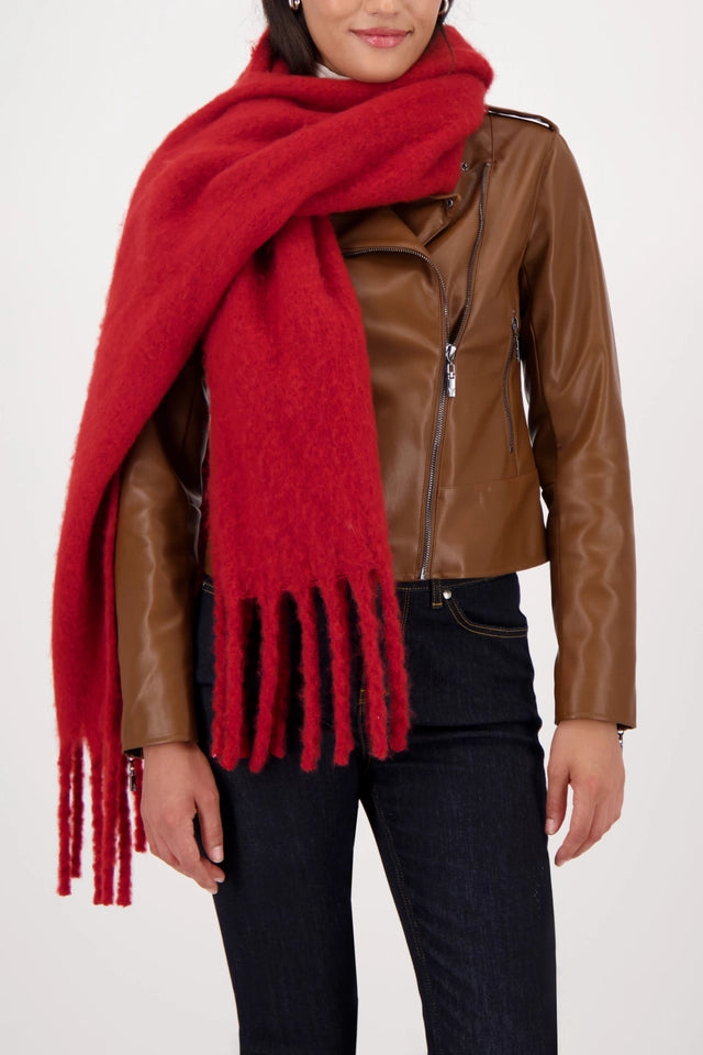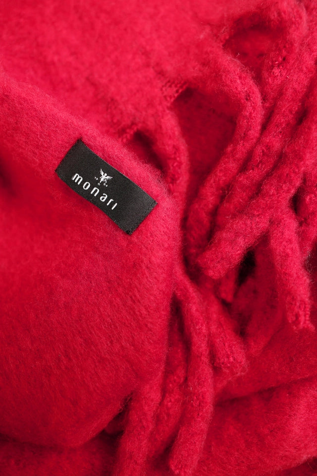 Bufanda esponjosa color rubí de la firma MONARI. De tamaño rectangular y con unos flecos largos tiene unas dimensiones generosas de 180x40cm. Colección de MONARI en diheratelier.com
