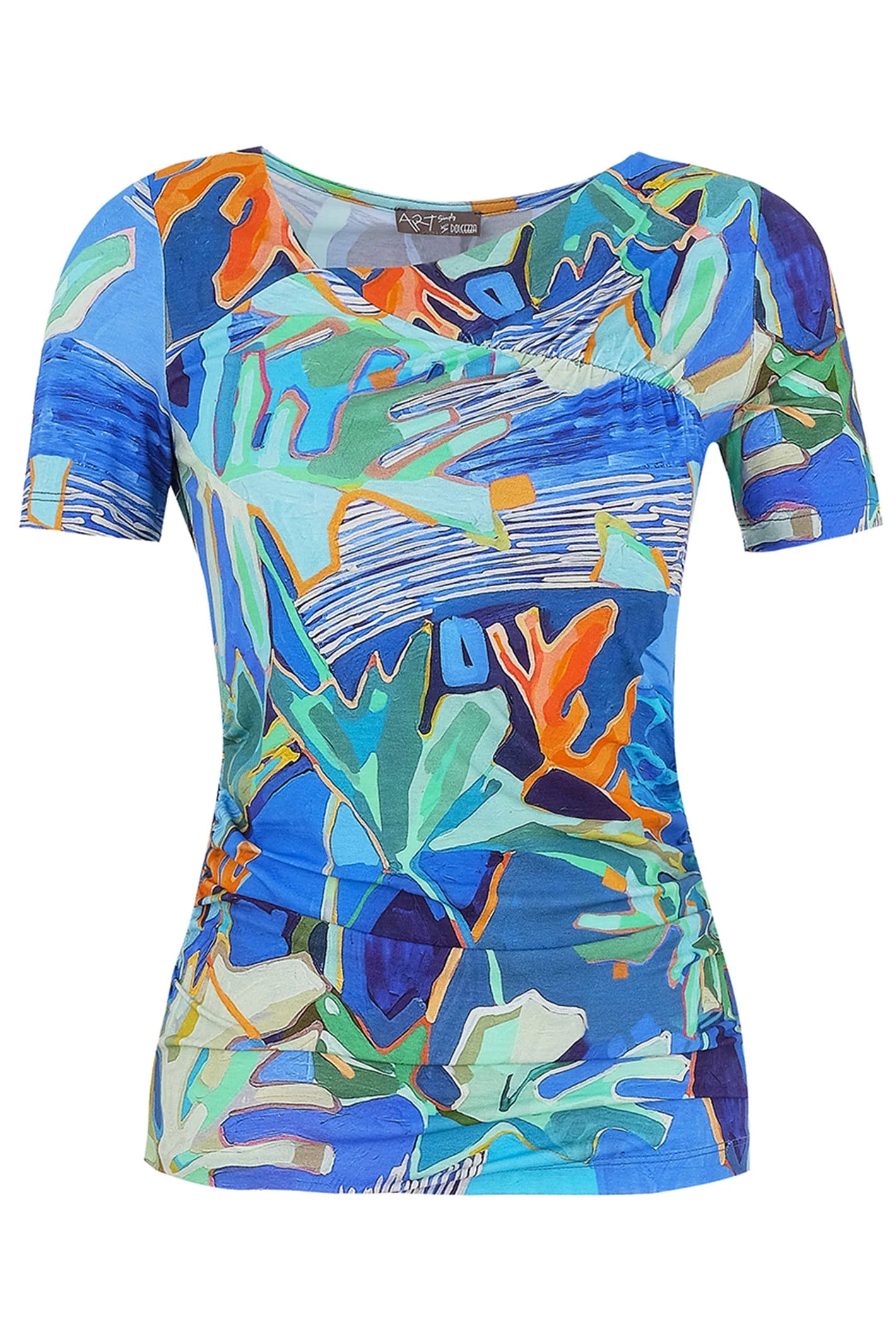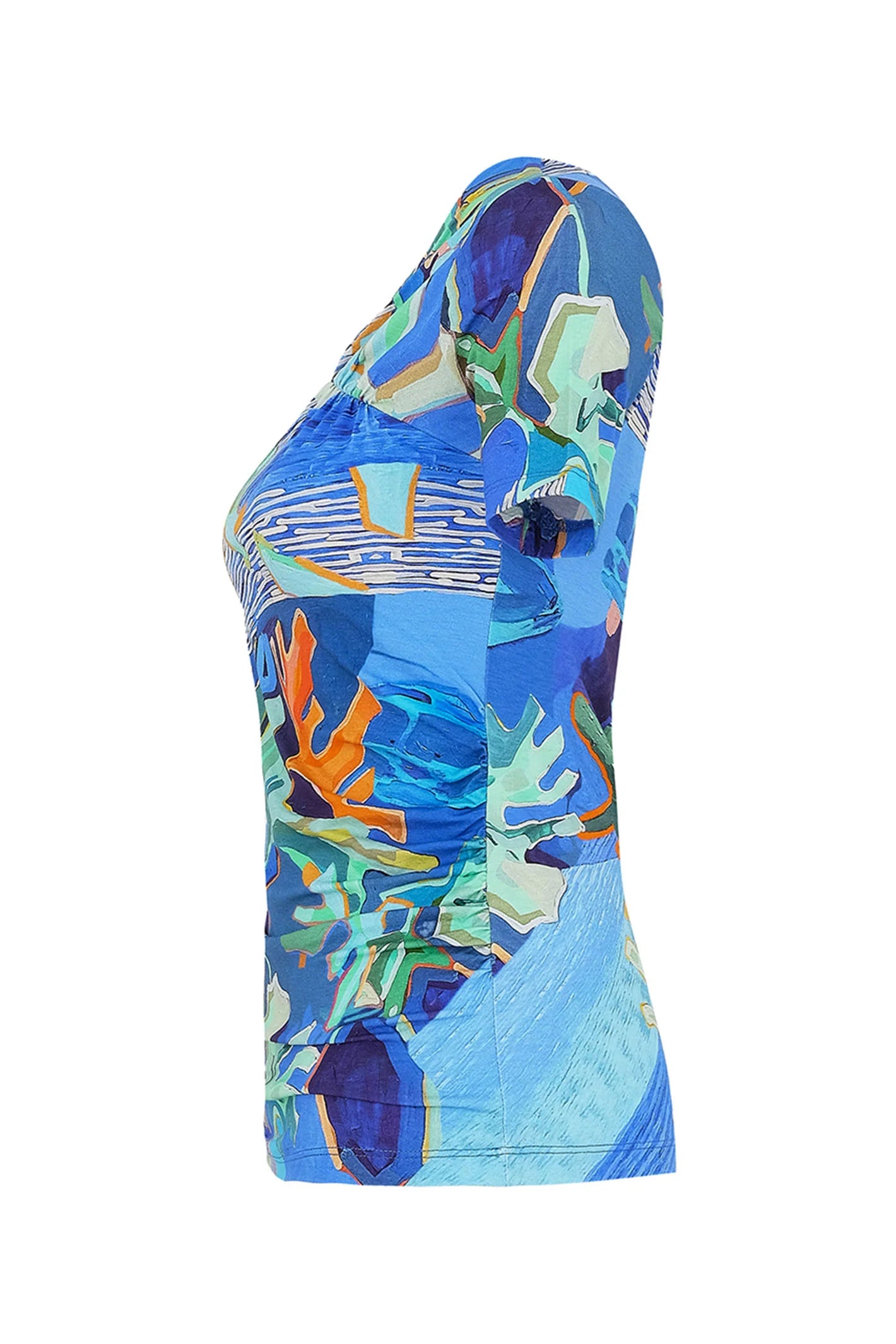 Camiseta cuello asimétrico de la firma DOLCEZZA MONTREAL. La prenda esta estampada con una obra de la artista MARY SINGLETON en la que podemos ver el fondo del mar, tiene manga corta, frunces laterales y un ajuste cómodo. Colección de DOLCEZZA MONTREAL en diheratelier.com