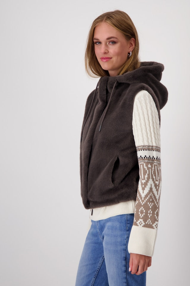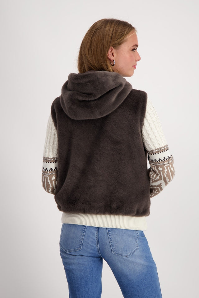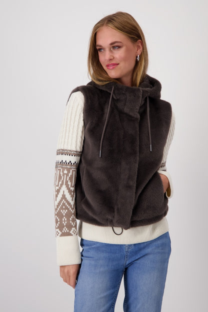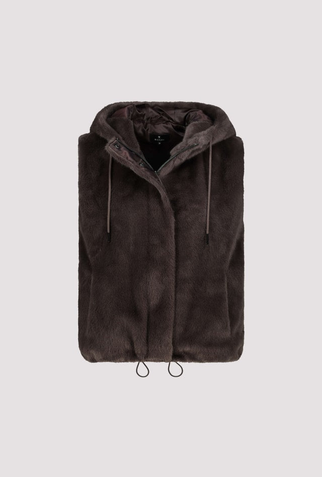 Chaleco de piel sintética de MONARI con capucha de agradable tacto. La prenda tiene un cordón elástico en el bajo que permite un ajuste cómodo y prácticos bolsillos laterales para calentar las manos. Es ideal para outfit urbanos con bonitos jerséis de la colección otoño-invierno. Colección de MONARI en diheratelier.com
