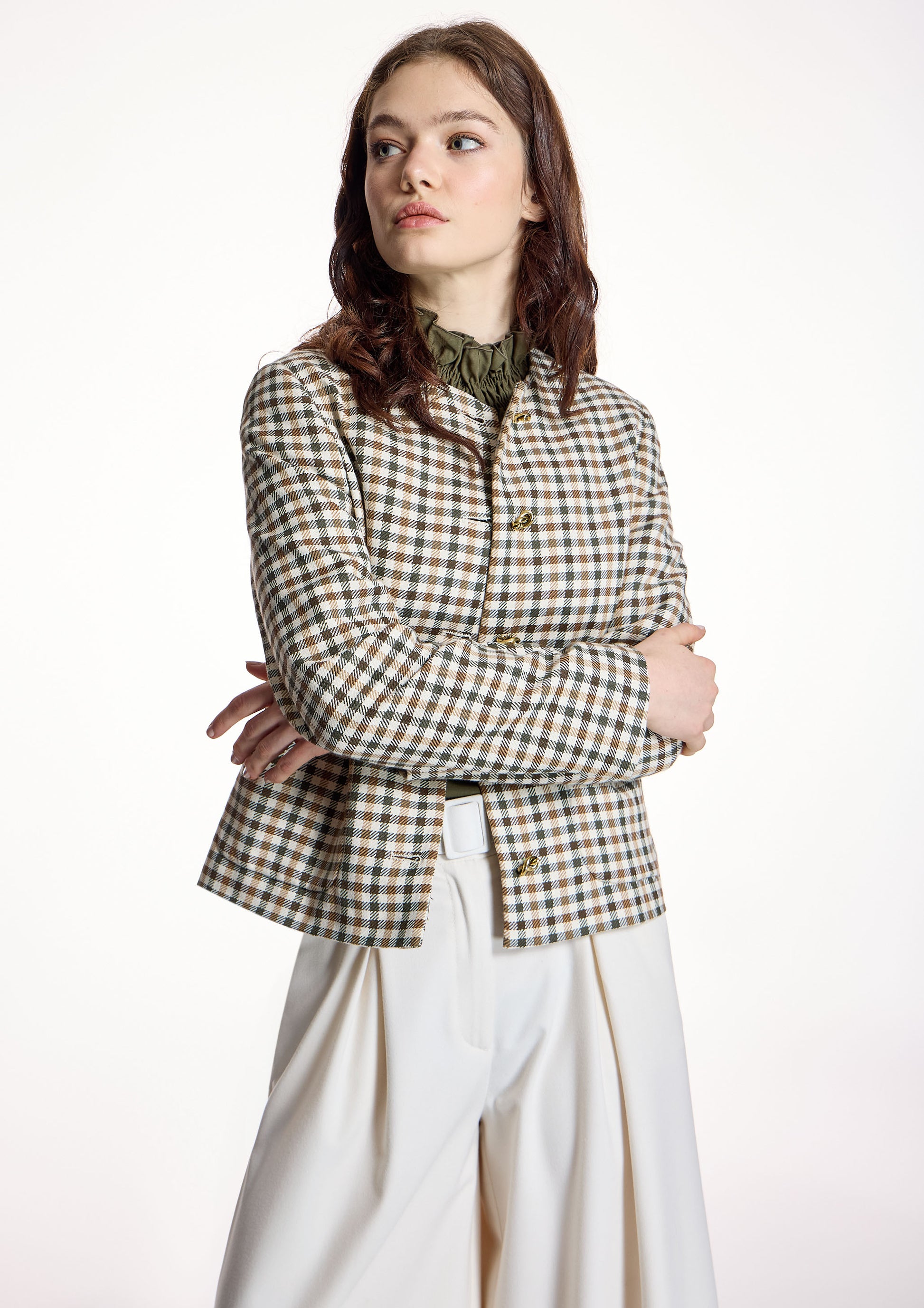 Chaqueta corta de cuadros tostados y caqui de la firma ALBA CONDE. La prenda de corte recto, cuello redondo y manga larga. Detalle de bolsillos de plastrón en el delantero con botón, cierre central delantero con botones de fantasía y forro interior. Colección de ALBA CONDE en diheratelier.com