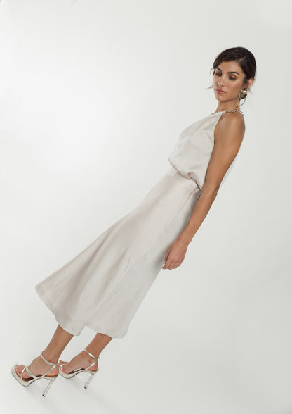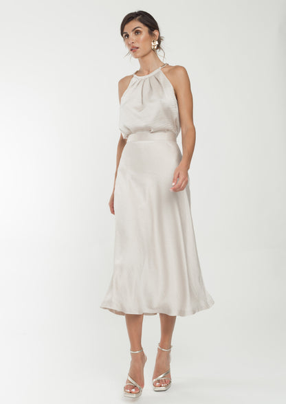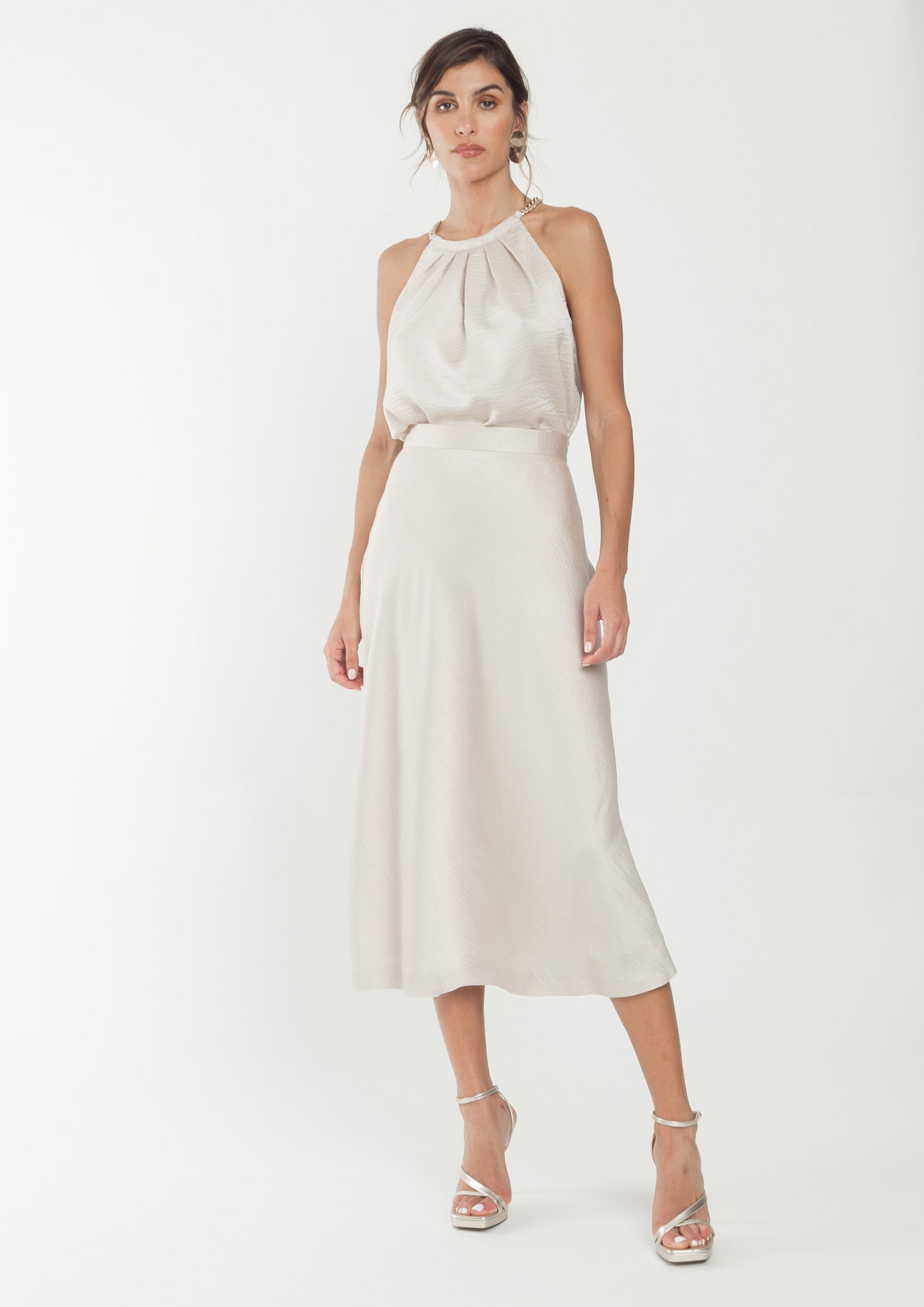 Falda midi satinada de ALBA CONDE en satén color beige. Presenta talle a la cintura, corte evasé, y cierre lateral con cremallera invisible y botón interior. Incluye forro interior. Parte de la colección FIESTA, ideal para un look elegante y sofisticado.