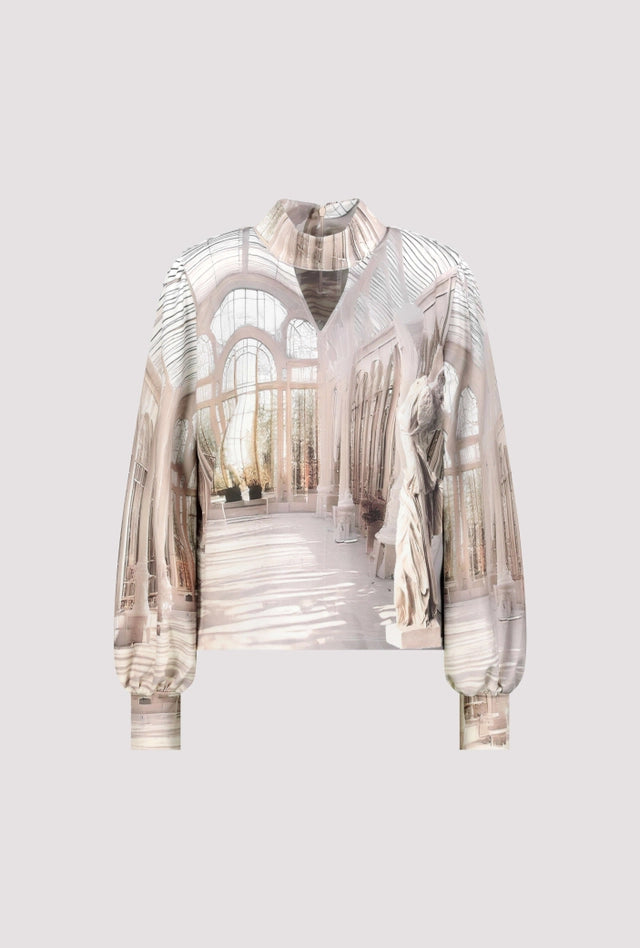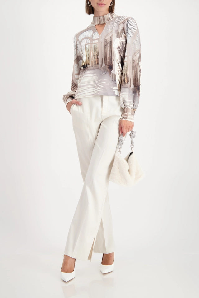 Jersey con estampado de galería de la colección MONARI. La prenda realizada en material elástico con modal tiene un tacto suave, corte regular, cuello alto con abertura, mangas largas con puño, bajo recto y cremallera invisible en centro de espalda. Colección de MONARI en diheratelier.com