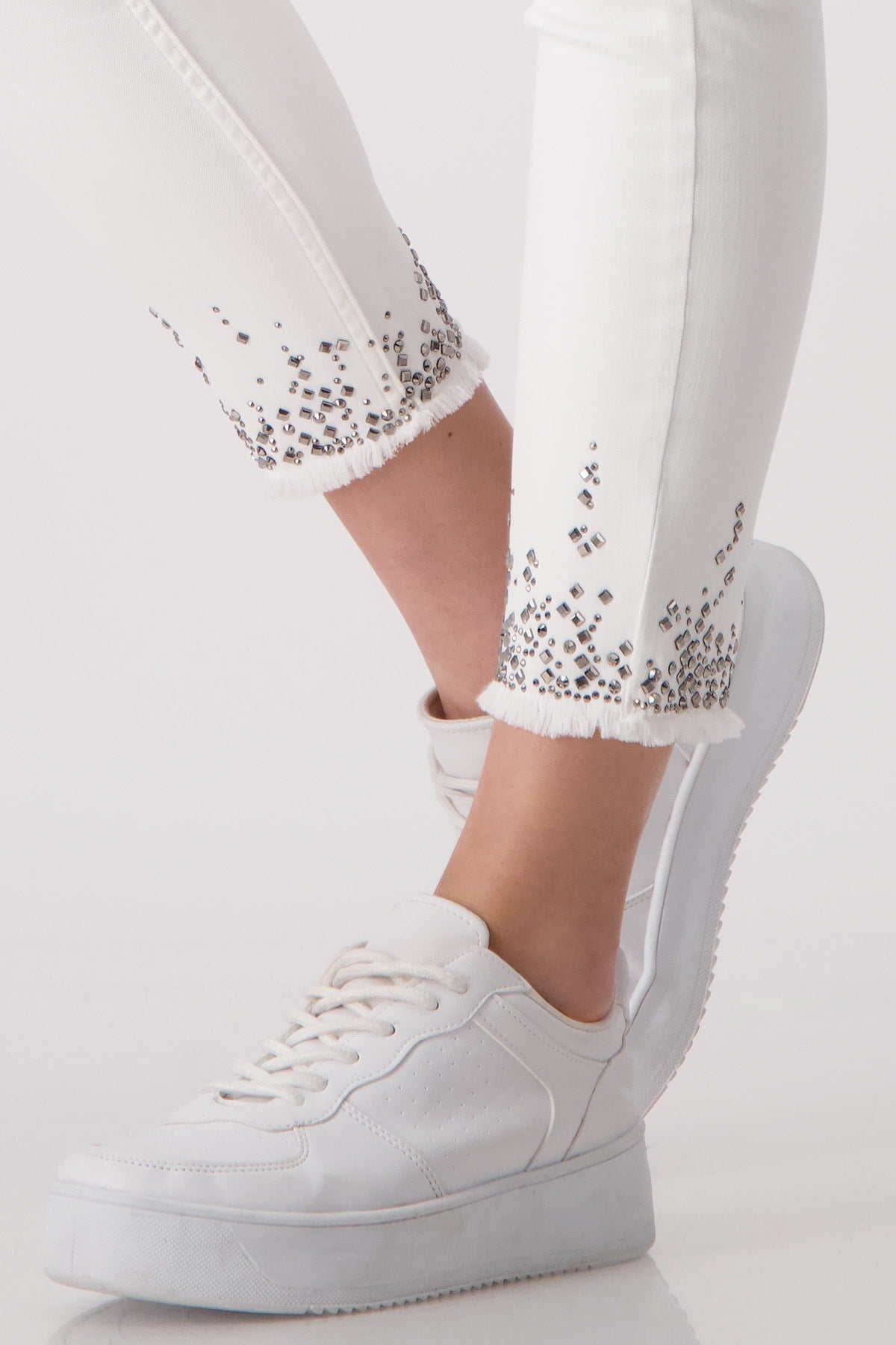 Pantalón Monari de corte vaquero con dobladillo decorado y desflecado, realizado en tejido de algodón de alta calidad. Corte ajustado, altura normal de cintura, cierre con cremallera y botón. Colección de MONARI en diheratelier.com
