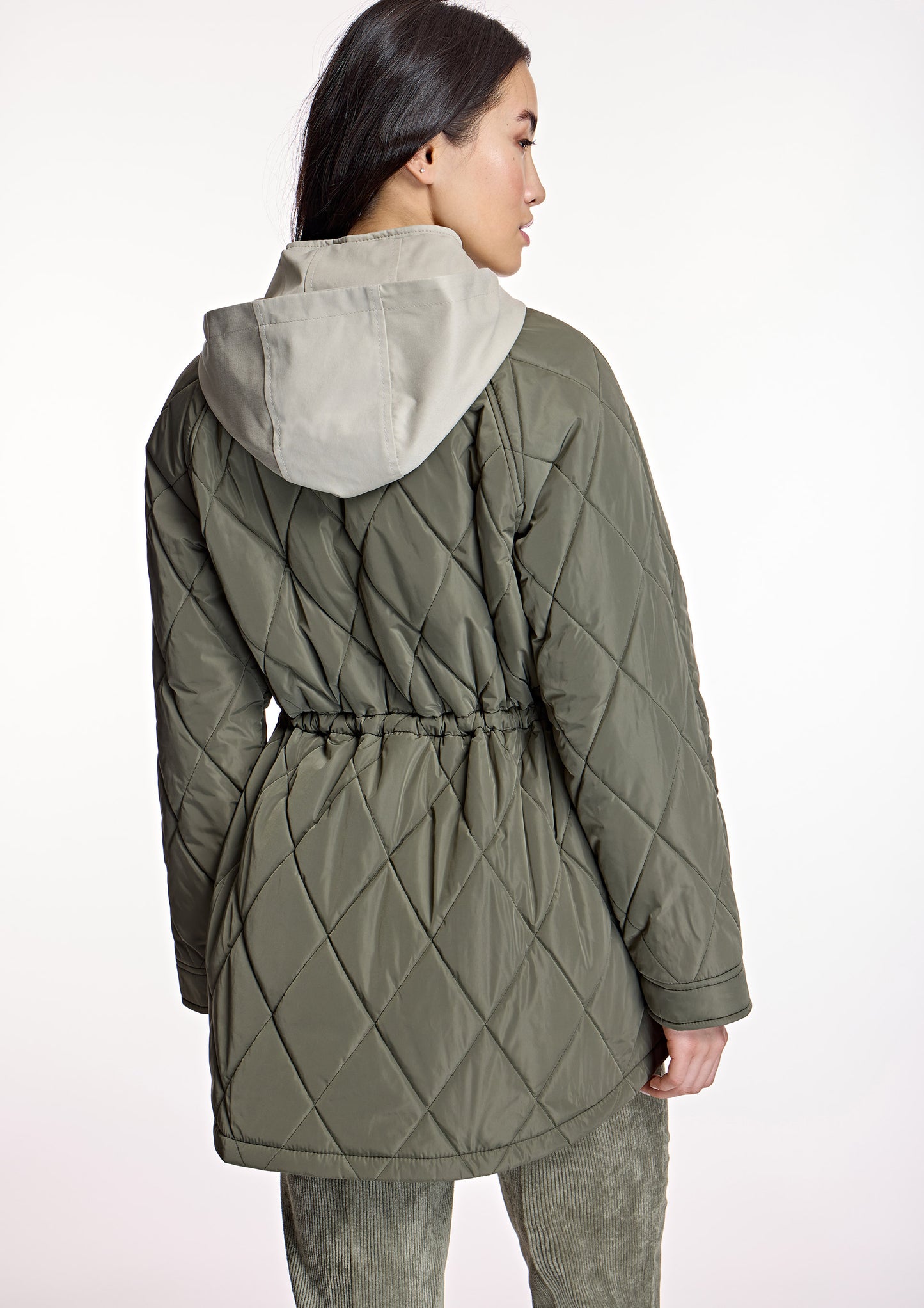 Parka color kaki de ALBA CONDE; la prenda presenta una bonita combinación de colores en tejido técnico verde y beige, capucha desmontable con cremallera, cuello alto, manga ranglan larga, ajuste con cordones en la cintura, bajo asimétrico mas largo en la espalda, bolsillos de tapeta y de vivo en el delantero. Cierre central con cremallera metálica oculta por solapa y forro interior. Colección de ALBA CONDE en diheratelier.com