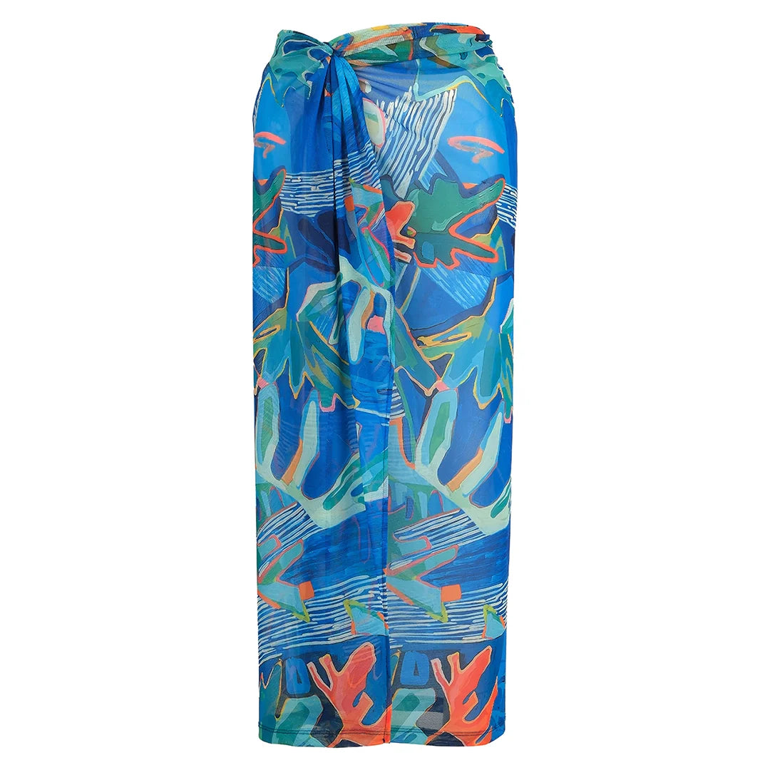 Sobrefalda para la playa estampada en vivos colores, motivo del estampado el fondo del mar. La prenda tiene un original recogido en la cintura y un largo midi. La obra en la que se realiza la impresión de la prenda es de la artista MARY SINGLETON. Colección de DOLCEZZA MONTREAL en diheratelier.com