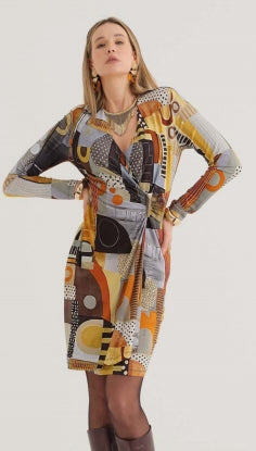 Vestido de punto estampado con un diseño abstracto artístico de Rashna Hackett, pintado en paleta de colores cálidos: marrón, negro y naranja. El modelo con recogido en la cintura, escote en V, manga larga tiene un ajuste cómodo y favorecedor. DOLCEZZAMONTREAL en diheratelier.com