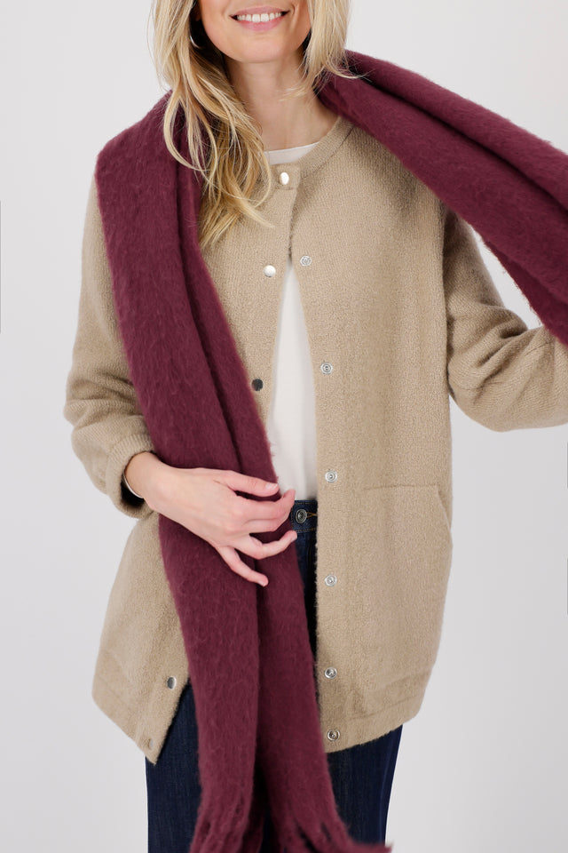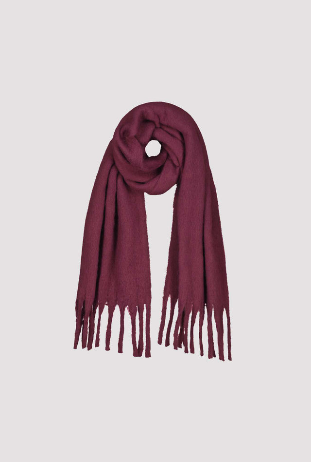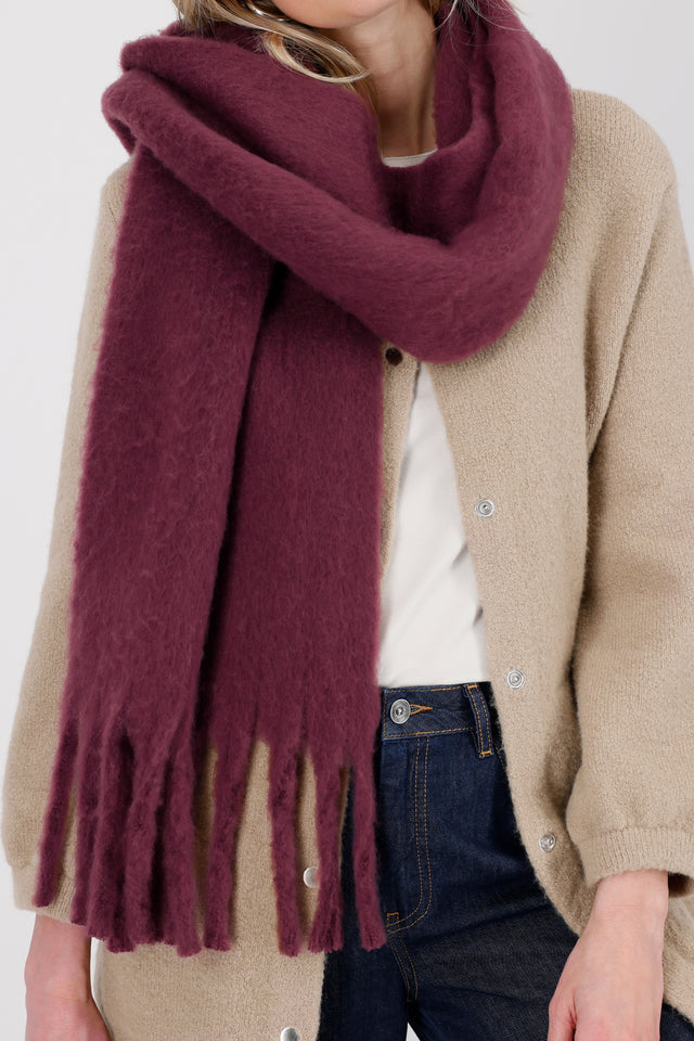 Bufanda esponjosa color burdeos de la firma MONARI. De tamaño rectangular y con unos flecos largos tiene unas dimensiones generosas de 180x40cm. Colección de MONARI en diheratelier.com