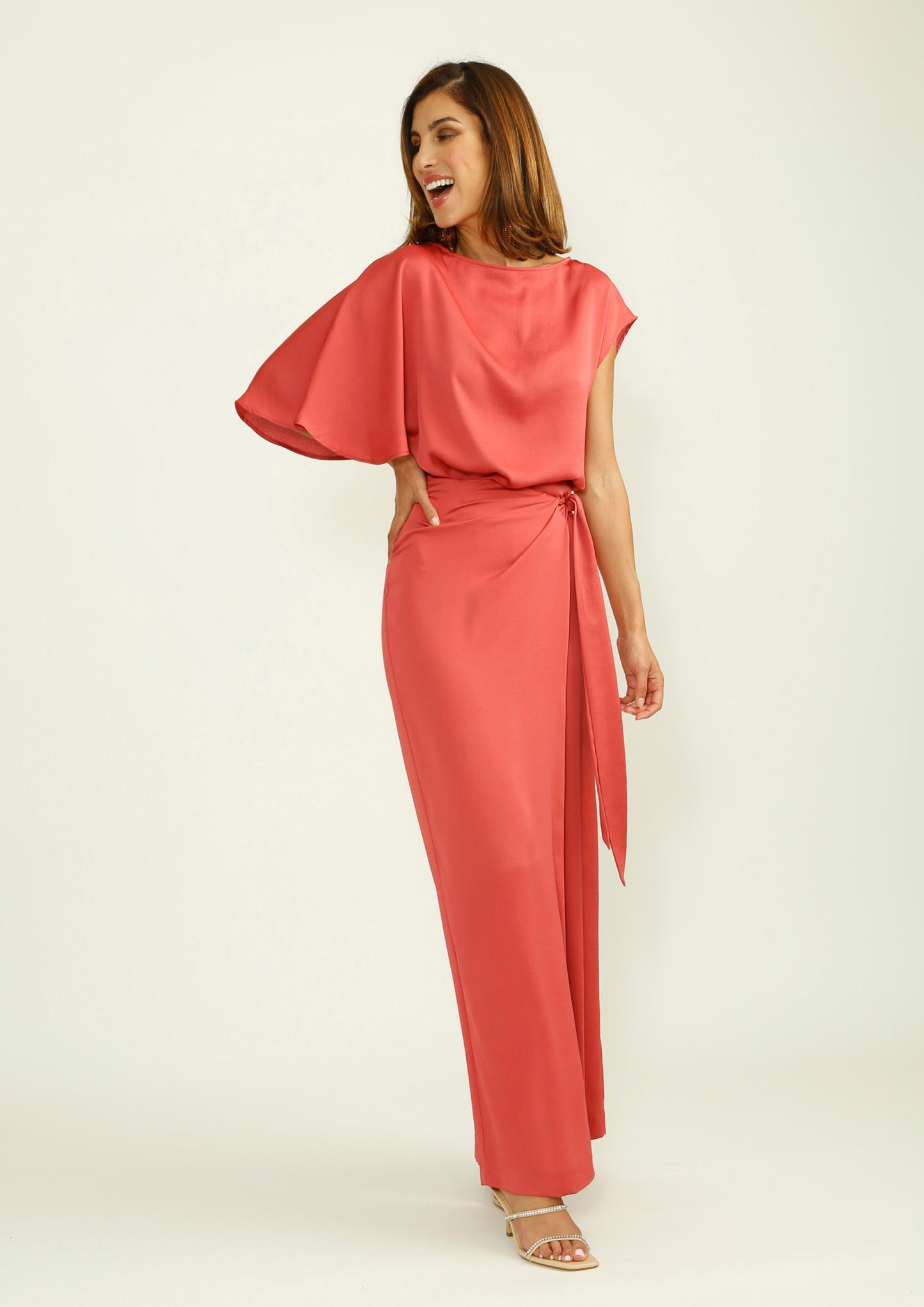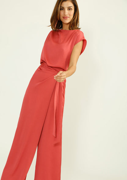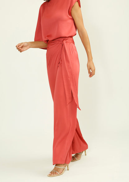Pantalón fluido satinado de ALBA CONDE con detalle de pareo en el delantero, atado en el lateral con lazada del tejido. Presenta tiro medio, corte palazzo, y cierre central posterior con cremallera invisible y botón interior. Parte de la colección INVITADAS, ideal para un look elegante y sofisticado. Colección de ALBA CONDE en diheratelier.com