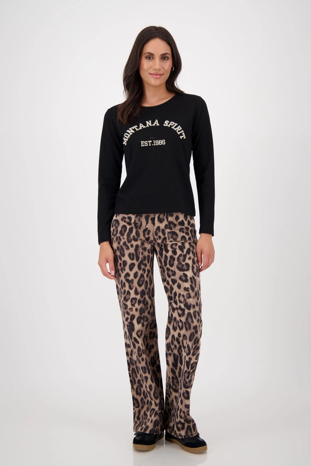 Sudadera negra con aplicaciones de pedrería de la firma MONARI. La prenda de cuello redondo, manga larga, ajuste regular y bordado con el lema "Montana Spirit" en el delantero; perfecta en look casuales. Colección de MONARI en diheratelier.com