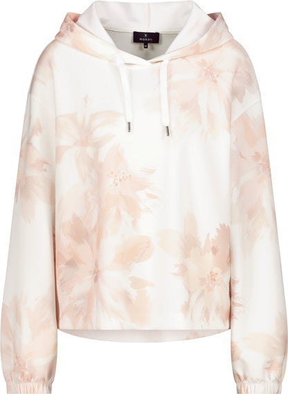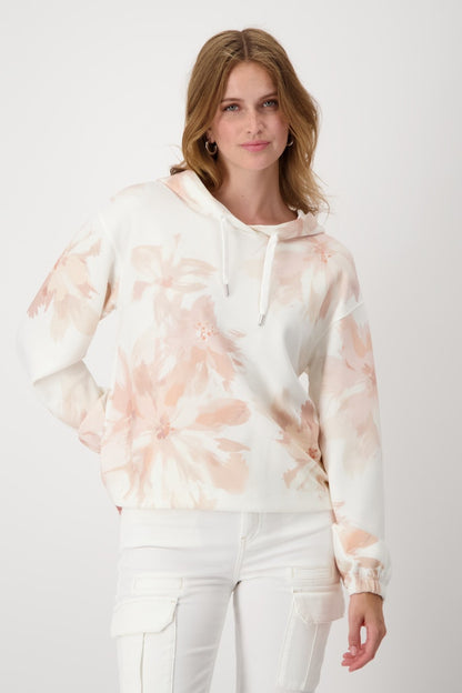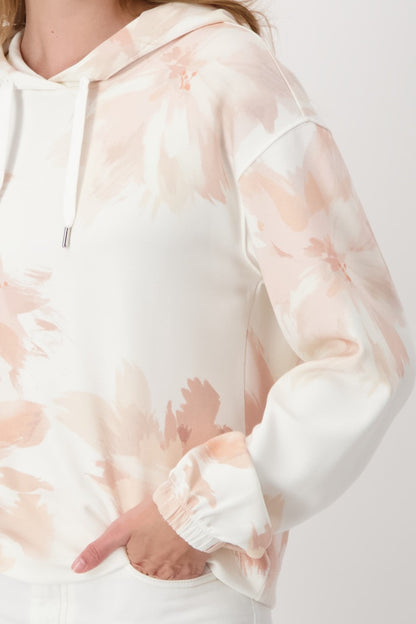 Sudadera con capucha y estampado floral en suaves tonos melocotón de la colección MONARI. Esta prenda de corte recto y manga larga con puño, es ideal en los outfit de fin de semana. Colección MONARI en diheratelier.com