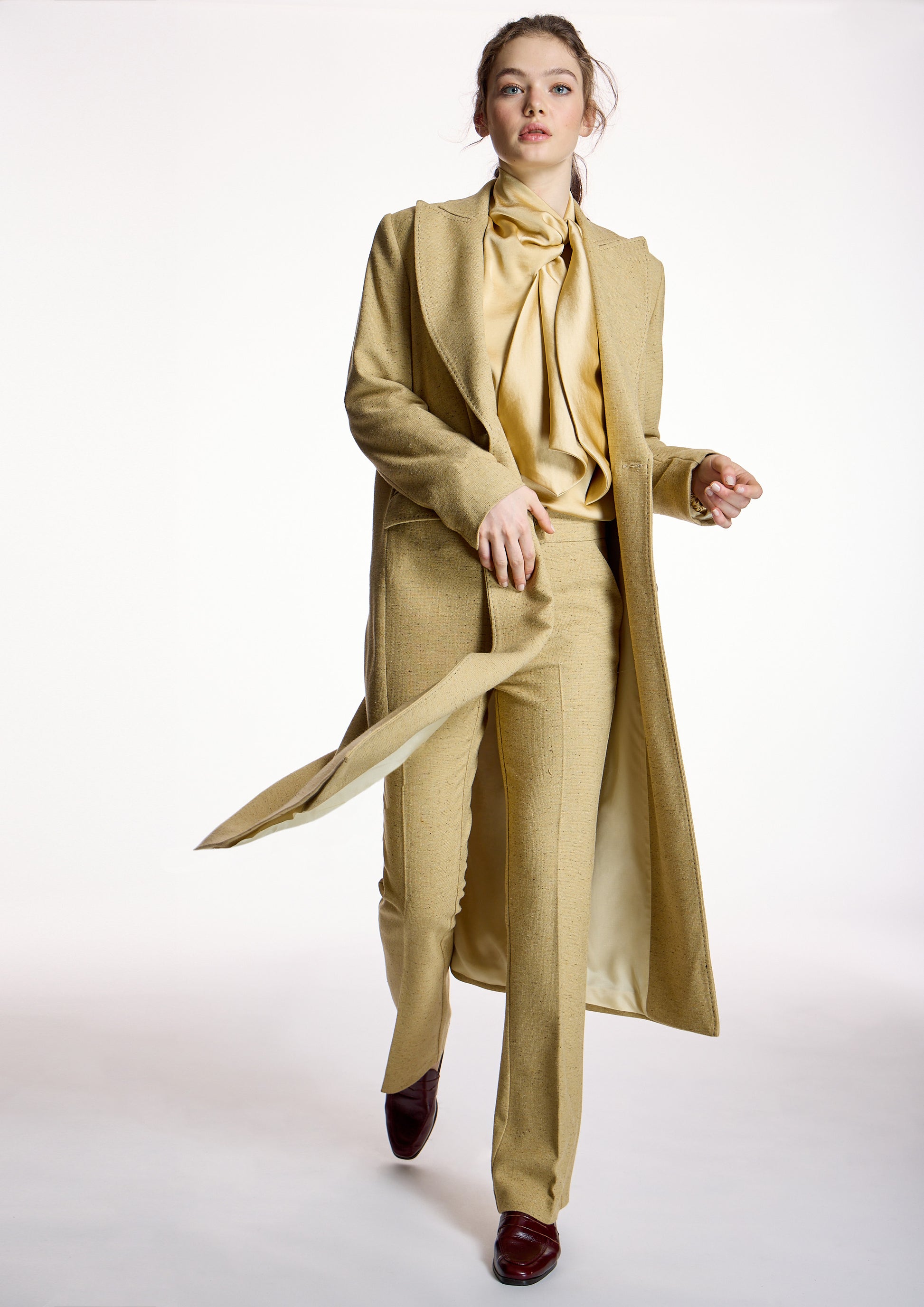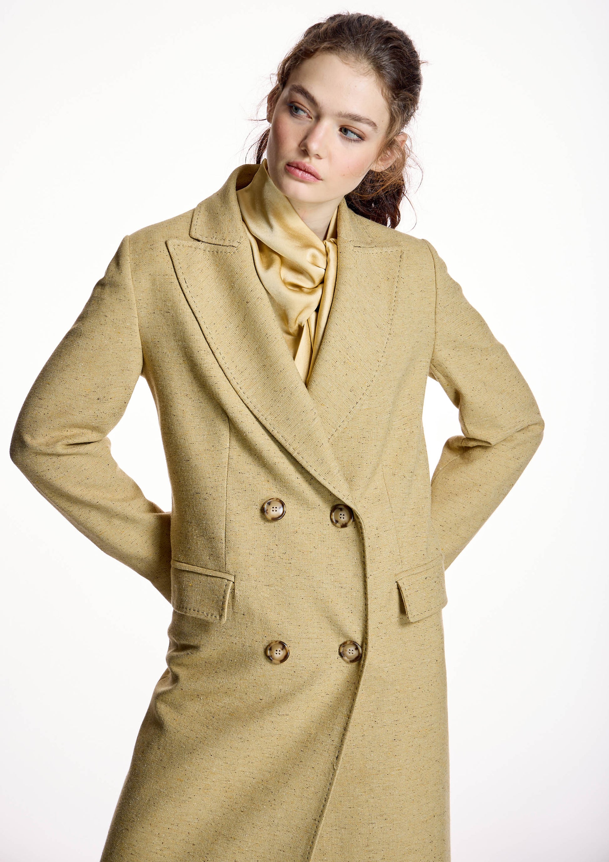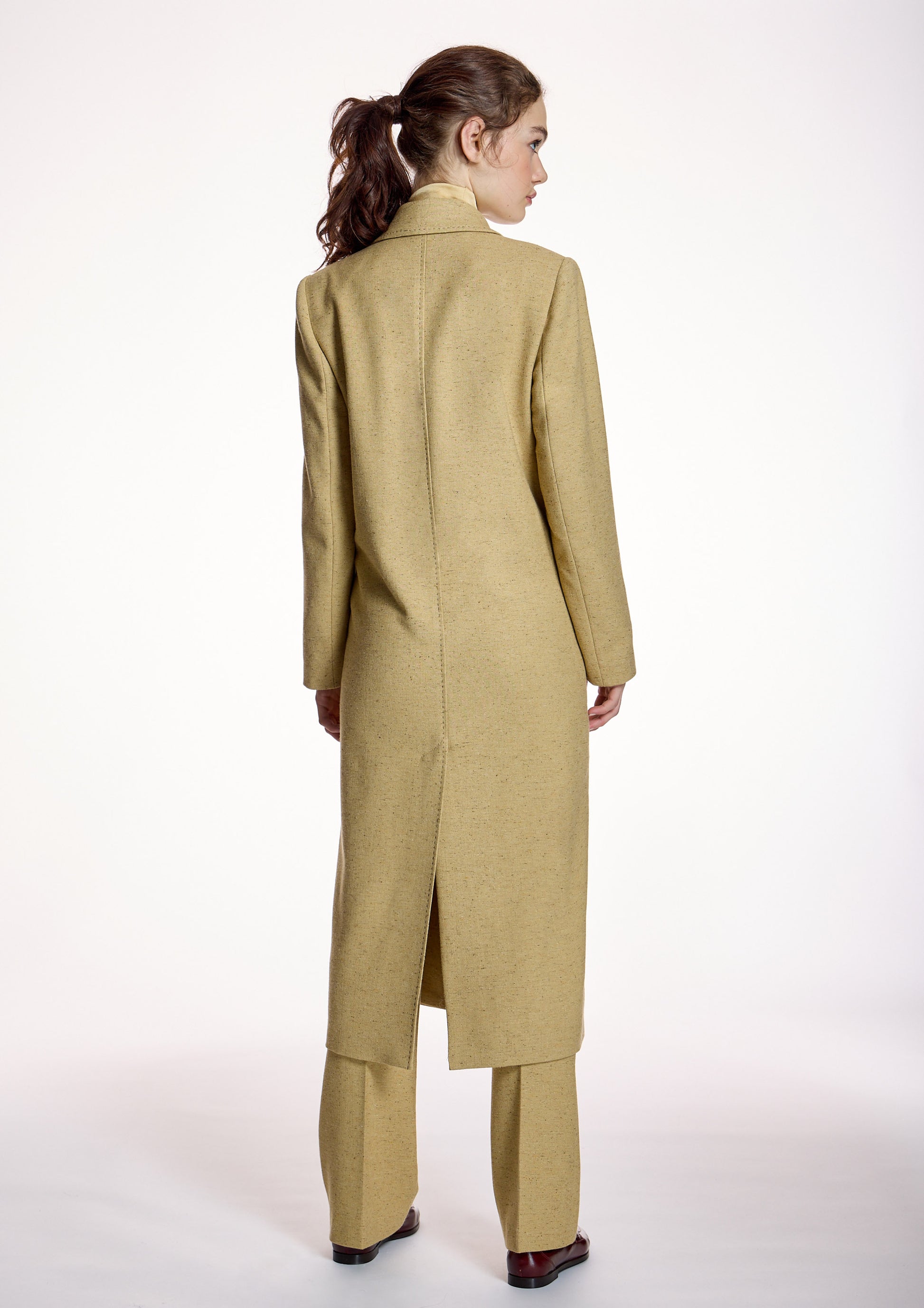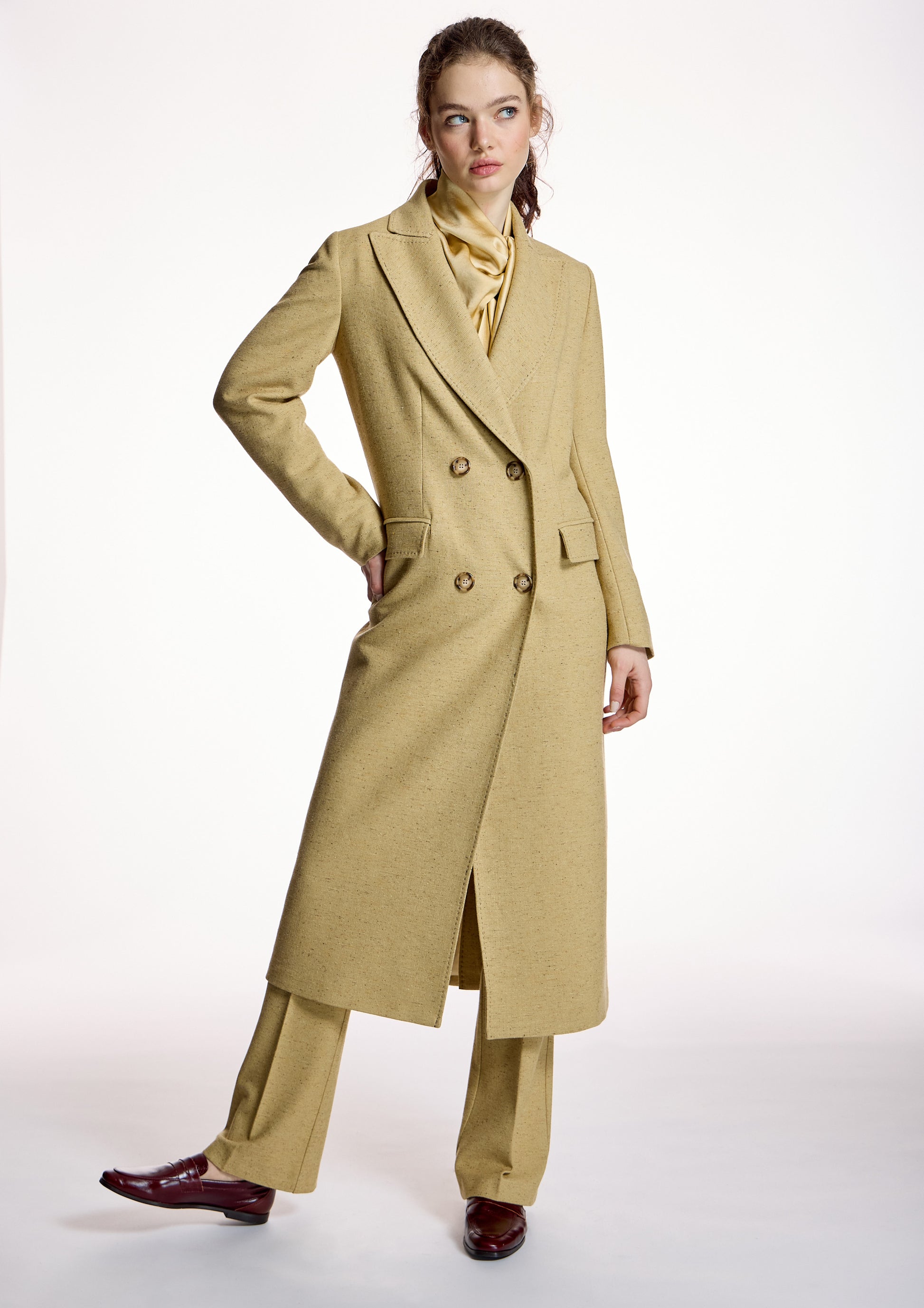 Abrigo semientallado largo amarillo de la firma española ALBA CONDE. La prenda tiene cuello solapa, doble cruce de cuatro botones, bolsillos con tapa en el delantero a la altura de la cintura, manga larga, forro interior y abertura en el centro de espalda. Colección de ALBA CONDE en diheratelier.com