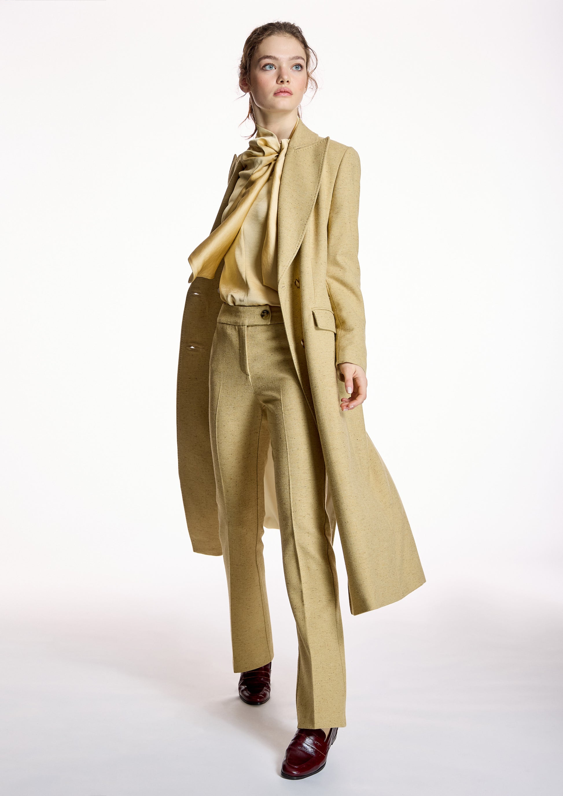 Blusa satinada color amarillo de la firma española ALBA CONDE. La prenda con bonita lazada en el cuello y escote con abertura, manga larga abullonada acabada en elástico, corte holgado y bajo ligeramente redondeado rematado con pespunte. Colección de ALBA CONDE en diheratelier.com