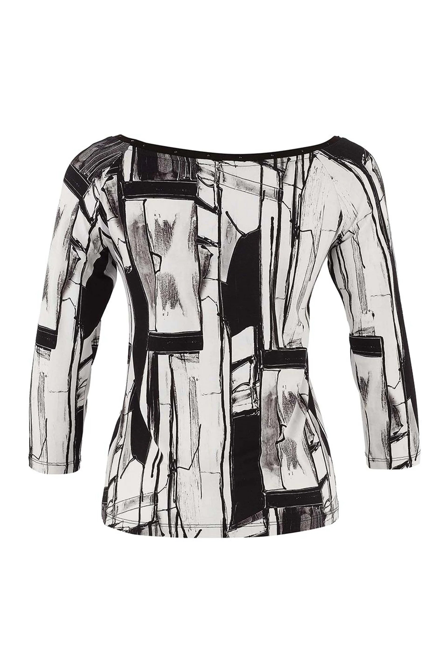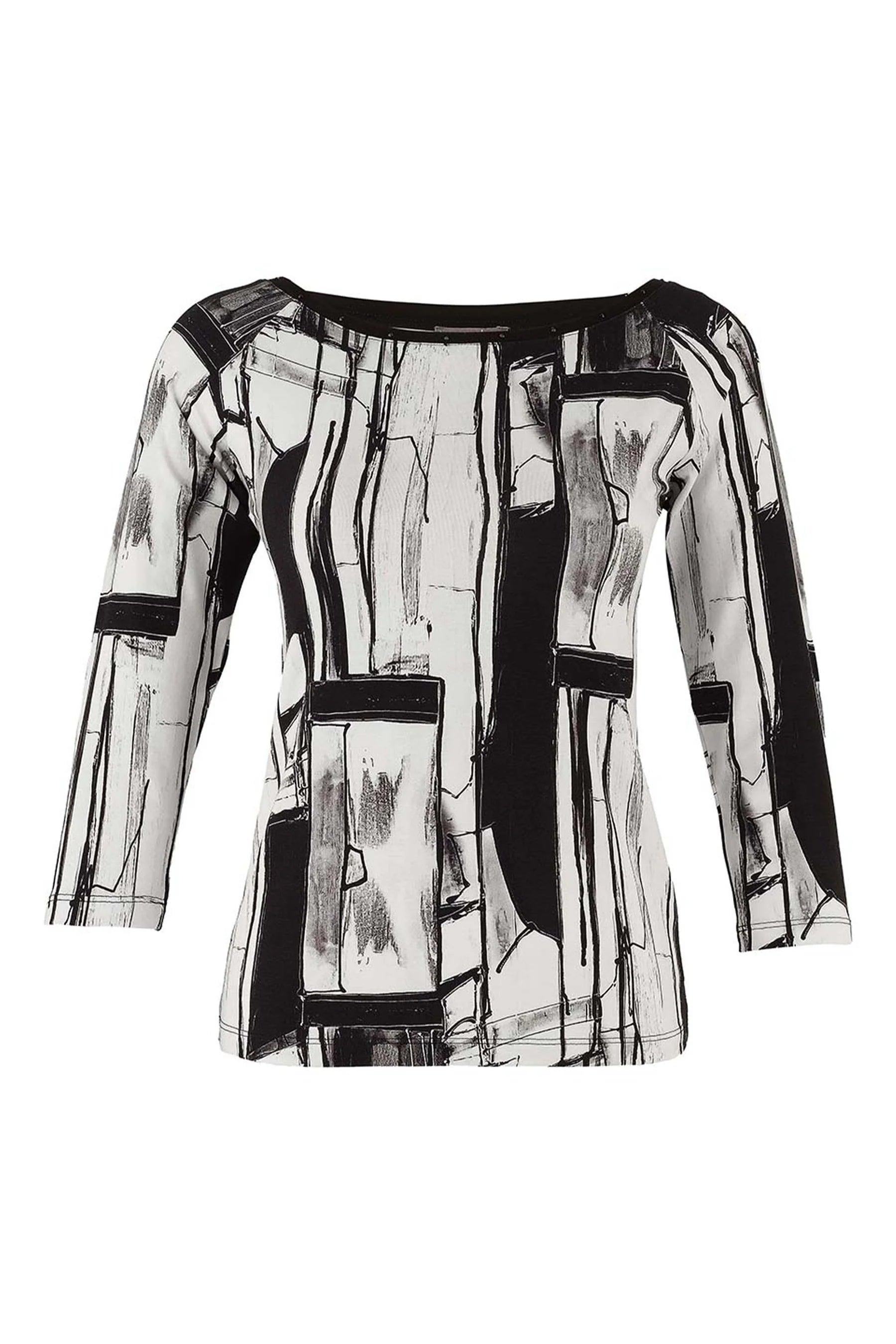 Camiseta estampado abstracto blanco y negro de la firma DOLCEZZA MONTREAL. La prenda estampada en su totalidad tiene manga 3/4, cuello barco con pedrería, ajuste normal, largo a cadera y bajo recto. Colección de DOLCEZZA MONTREAL en diheratelier.com