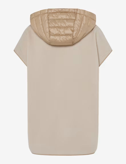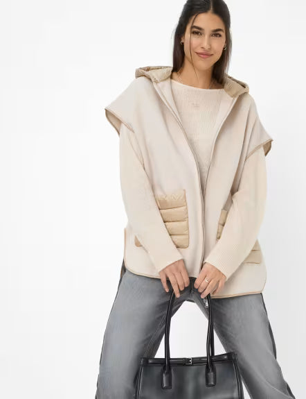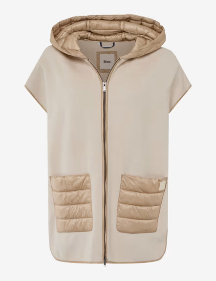 Capa estilo KYOTO mezcla de lana y acolchado en beige de la firma BRAX FEEL GOOD. La prenda presenta una silueta recta, hombros caídos, capucha acolchada, bolsillos de plastrón acolchados y cremallera bidireccional en el centro del delantero. Colección de BRAX FEEL GOOD en diheratelier.com