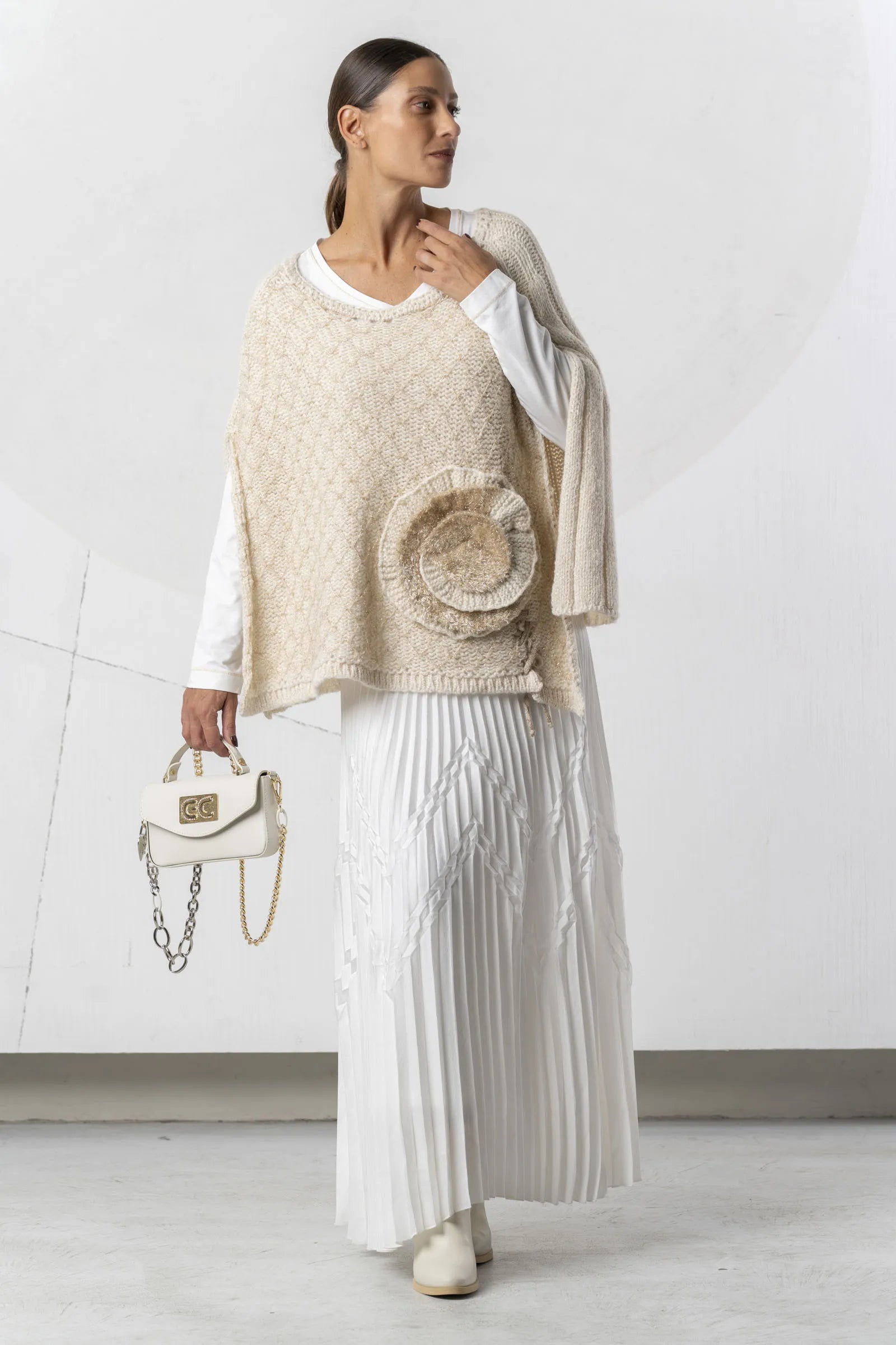 Capa de punto color crema y dorado con maxiflor de la firma italiana ELISA CAVALETTI. La prenda esta realizada con mezcla de hilo efecto piel y lúrex, amplias aberturas laterales, escote redondo y flor de grandes dimensiones en el delantero. Hecho artesanalmente en Italia. Colección de ELISA CAVALETTI en diheratelier.com