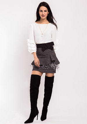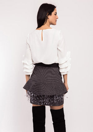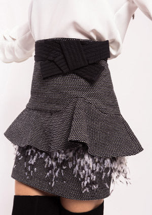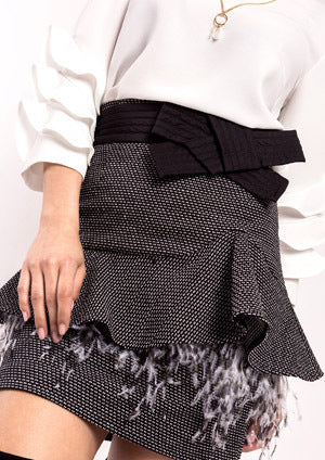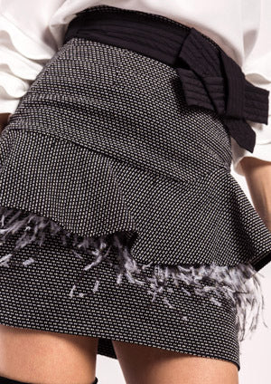 Falda jaspeada de ALBA CONDE a la cintura con volante en la cadera, adornado con plumas debajo del volante. Ideal para añadir un toque sofisticado y moderno a tu look. Colección de ALBA CONDE en diheratelier.com
