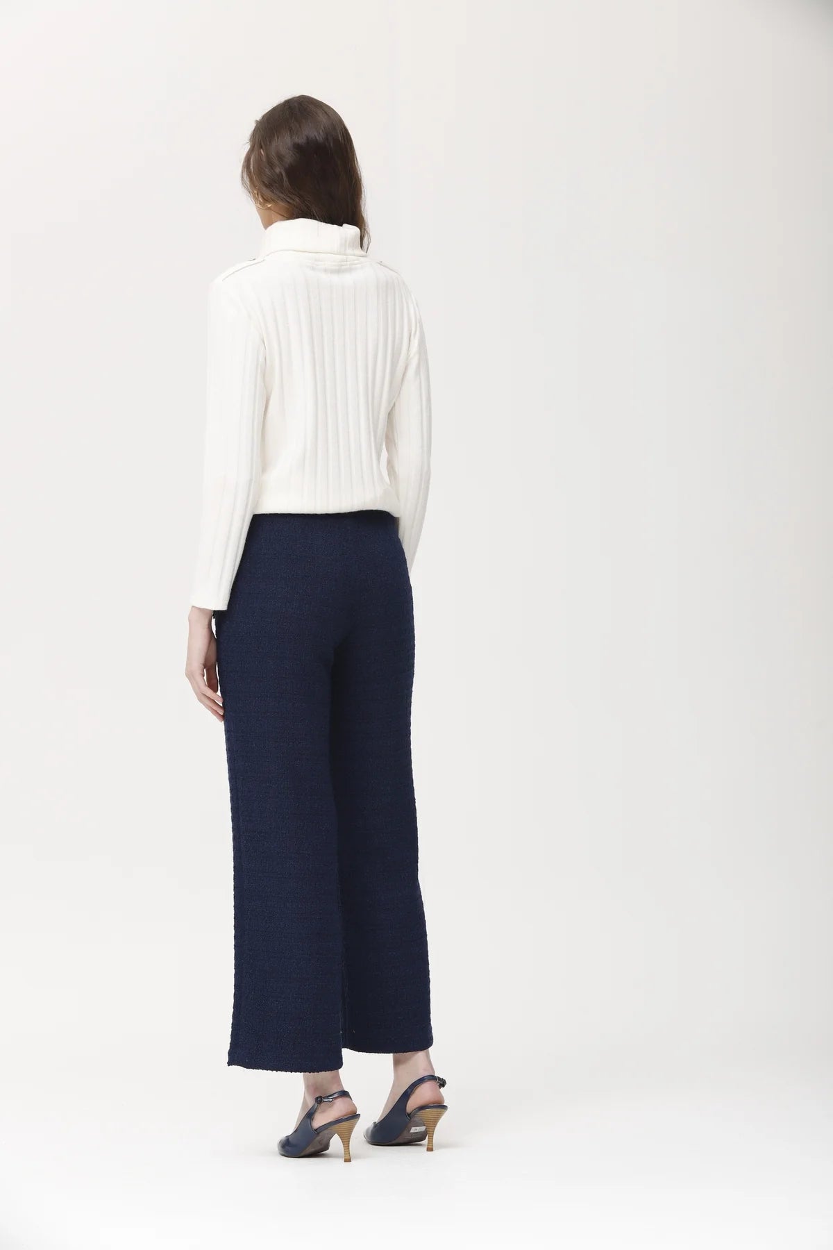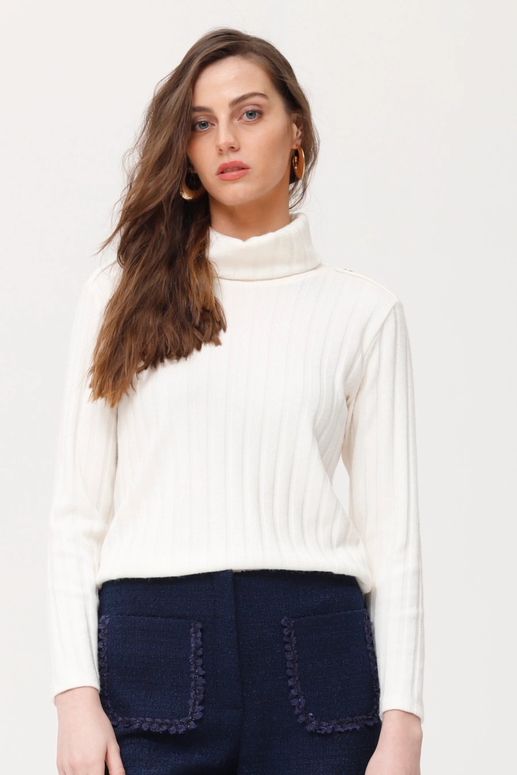 Jersey amplio en punto canalé de la firma OKY. La prenda de color crudo tiene cuello vuelto, manga larga, diseño de líneas limpias, adorno en los hombros con botón y realizado en tejido elástico muy suave. Colección de OKY en diheratelier.com