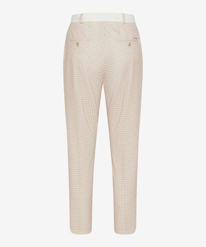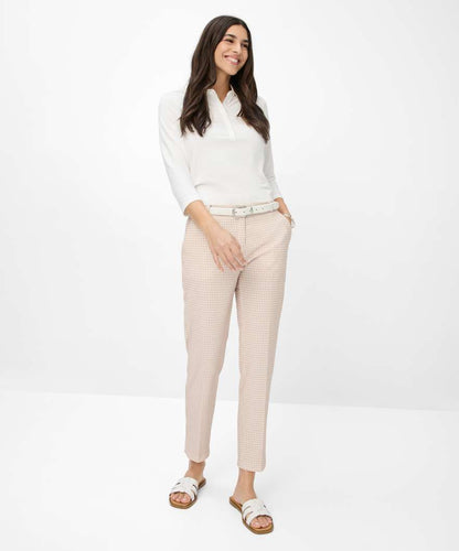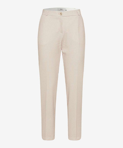 Pantalón de punto corte chino STYLE MARON S de la firma BRAX FEEL GOOD. Este clásico de largo 7/8 combina perfectamente en nuestros conjuntos casuales. Estampado en pata de gallo en blanco y camel, bolsillos delanteros franceses, bolsillos traseros ribeteados con botón, goma en la parte de atrás de la cintura y cierre con cremallera y botón. Colección de BRAX FEEL GOOD en diheratelier.com