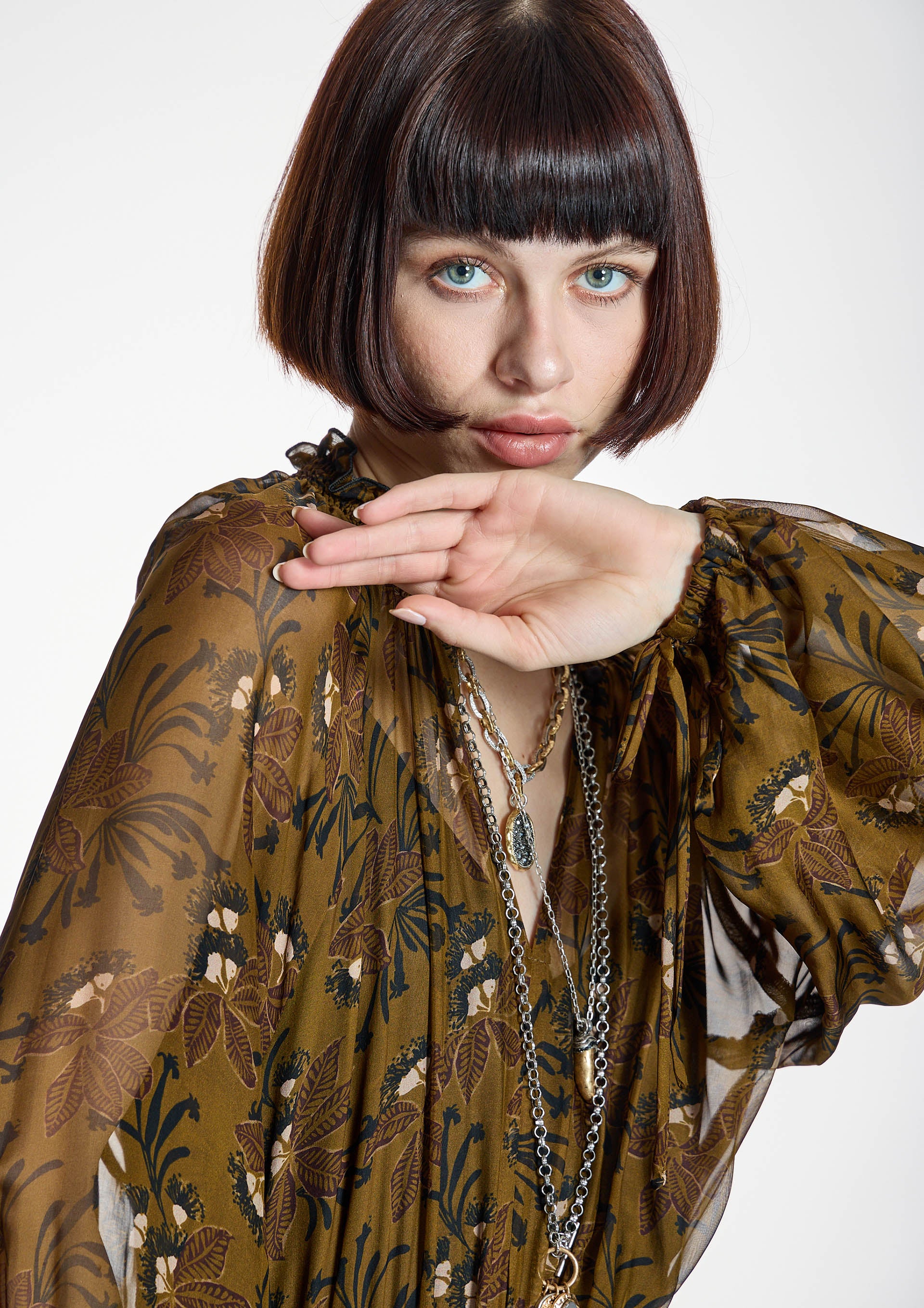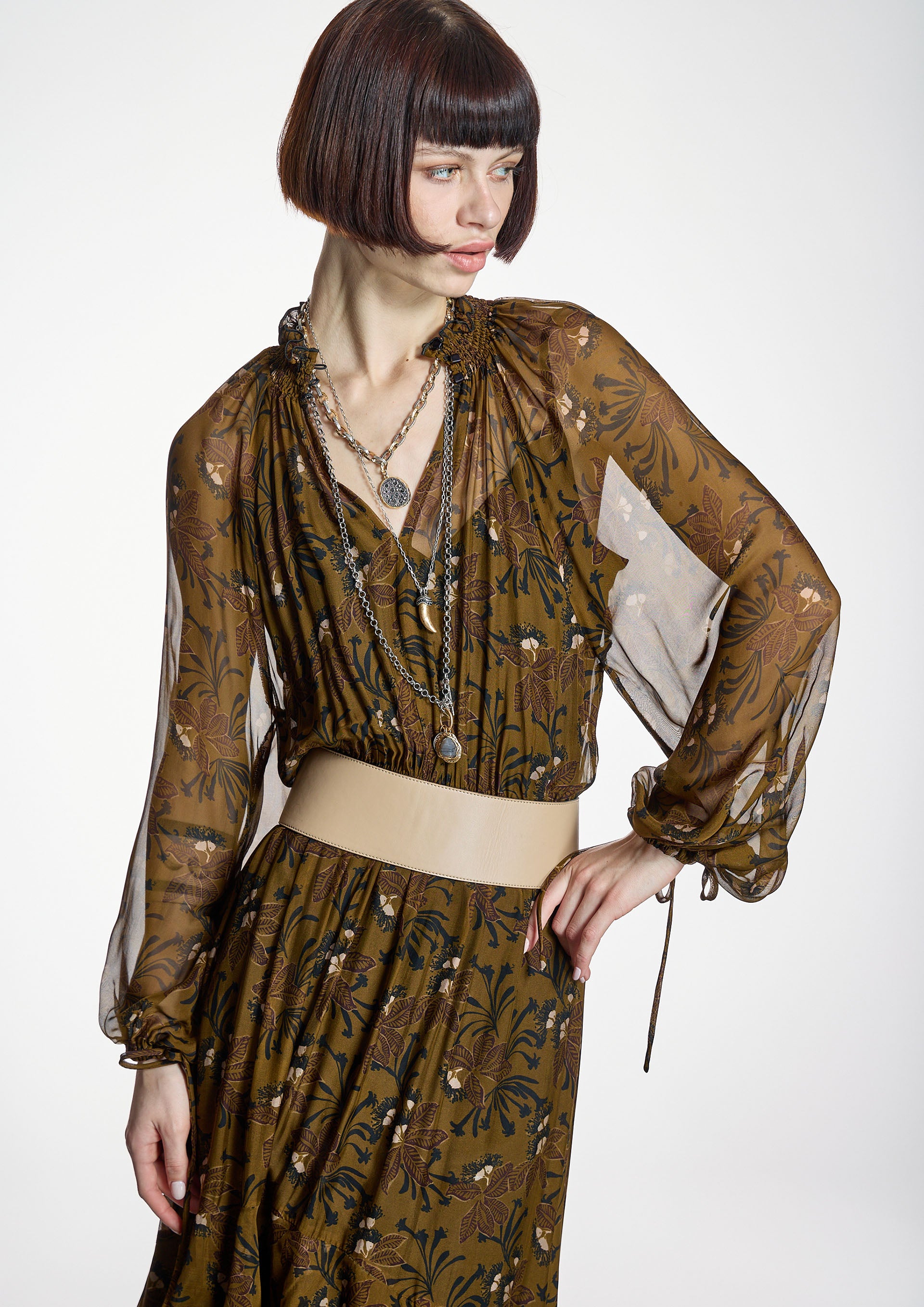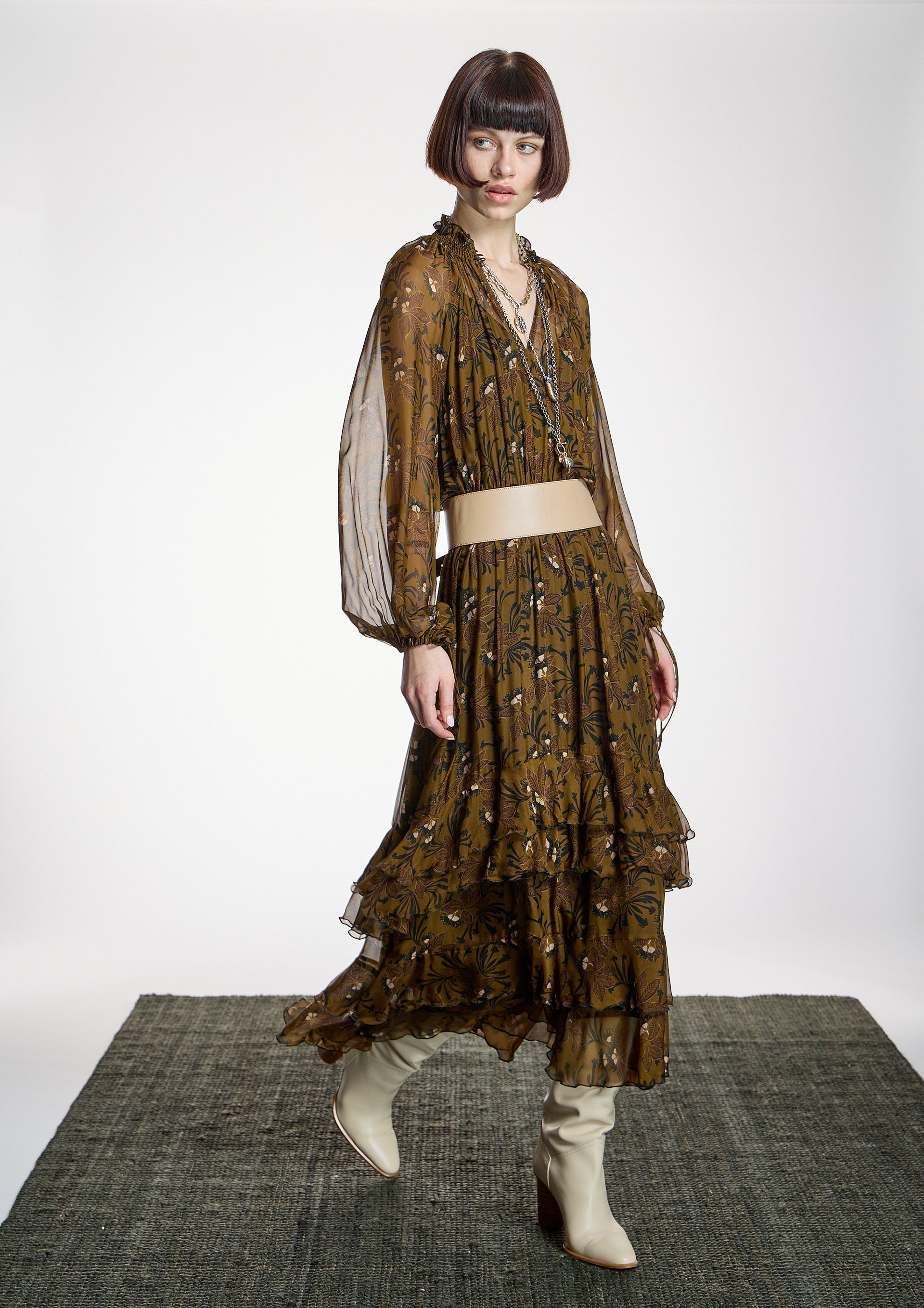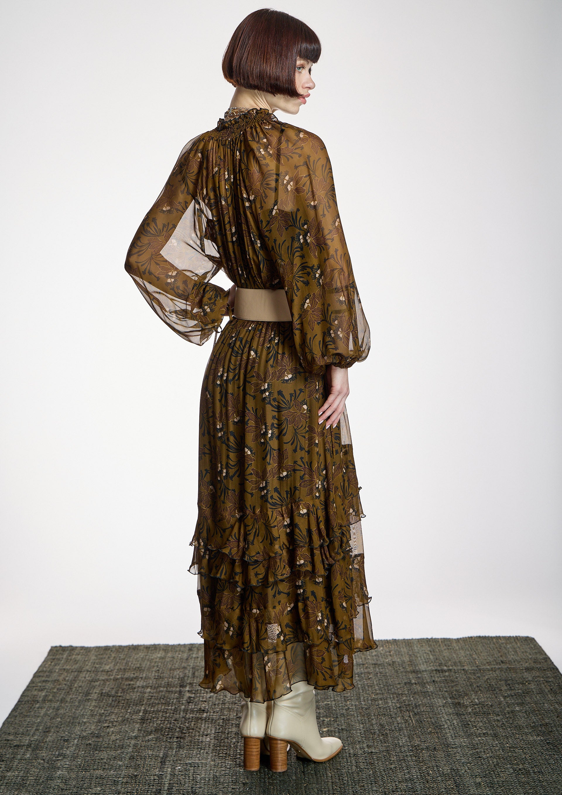 Vestido largo con estampado floral en verdes de la firma española ALBA CONDE. El modelo presenta escote redondo engomado con abertura, manga larga abullonada acabada con puños elásticos, corte entallado en cintura con elástico, falda con volantes y forro interior de tirantes. Cinturón no incluido. Colección de ALBA CONDE en diheratelier.com